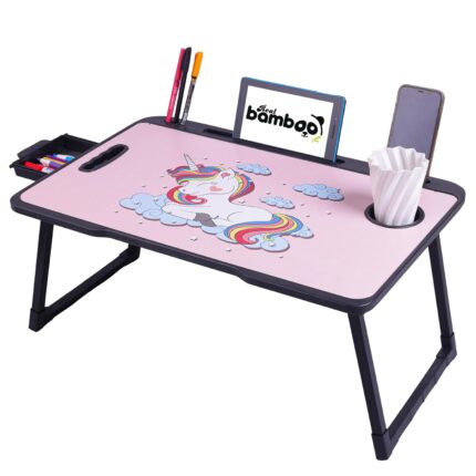 Real Bamboo Foldable Laptop Table for Bed Desk Portable Study Writing Multipurpose Adjustable Tray with Tablet Holder Cup Slot Storage Drawer (US Biding AUnicorn)