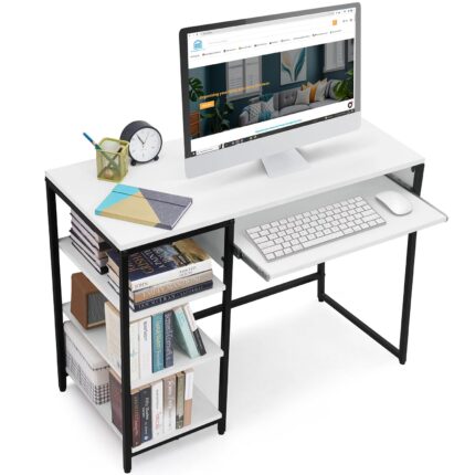 ABOUT SPACE Computer Table with 3 Tier Bottom Storage & Keyboard Tray – Modern Tabletop Office Desk for PC Laptop, Study, Writing, Gaming Open Bookshelf with Storage [L100 x B45 x H75 cm]White – Matte