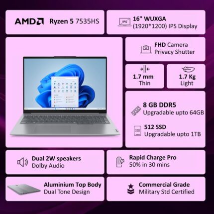 Lenovo ThinkBook 16 AMD Ryzen 5 7535HS (8GB RAM/512GB SSD/Win 11 Home/Office 2024/Backlit Keyboard/Fingerprint) 16″ WUXGA IPS 300 Nits Thin & Light Laptop/1Y Warranty/Aluminium Top/1.7kg, 21MWA0BRIN