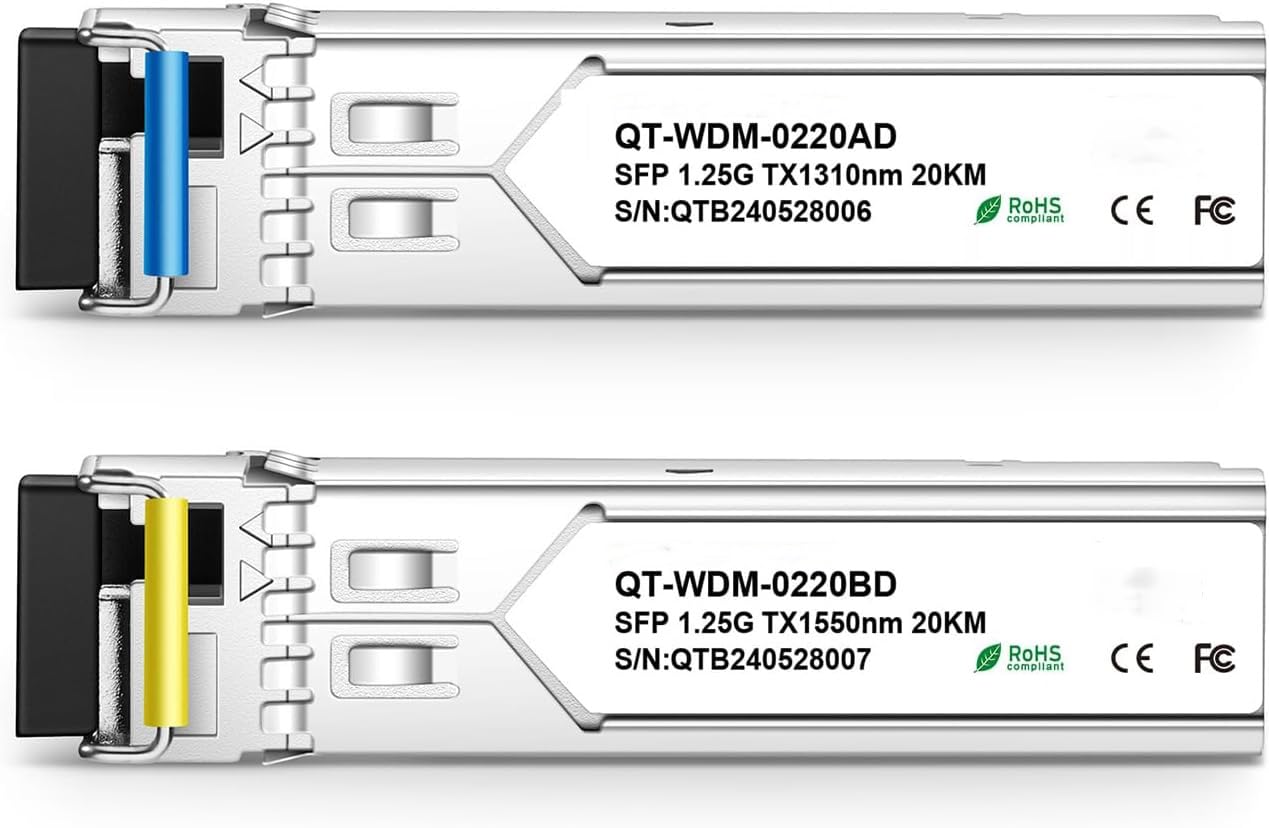 【Main Parameter】2 Pcs 1.25 Gbps industrial grade gigabit single mode BIDI SFP module, 1310nm/1550nm wavelength, LC simplex interface, up to 20km(12.42 mile) transimission; which can be widely compatible for Cisco, MikroTik, Ubiquiti, Netgear, TP-link, Dell, D-link, and ZyXel etc., .
