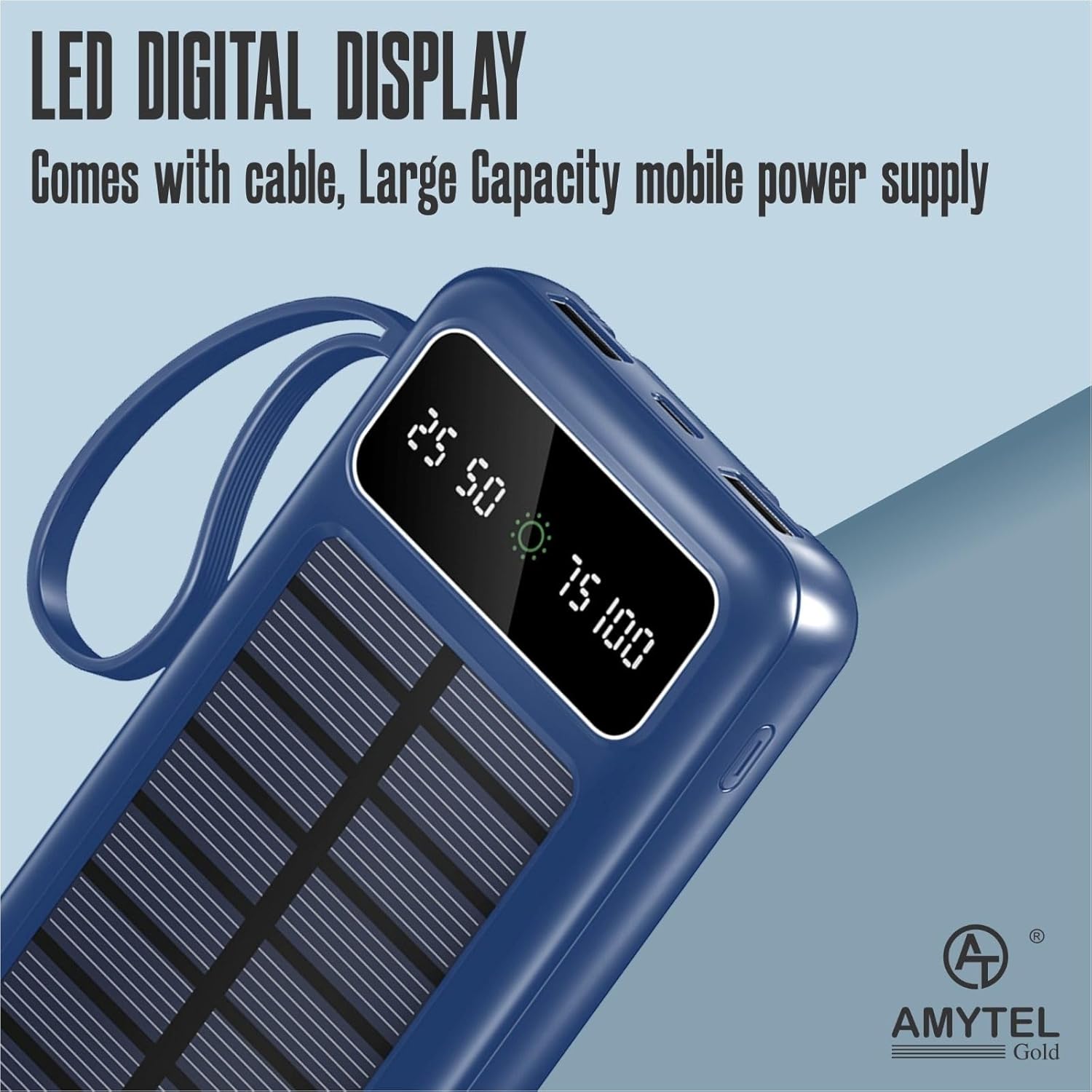 The AMYTEL 10000mAh Solar Power Bank is designed to provide dependable portable charging while offering additional features for outdoor and emergency use. With a battery capacity of 10000mAh, the power bank can recharge most smartphones multiple times depending on device battery size and usage conditions. The device includes built-in charging cables such as Type-C and Lightning, allowing users to charge compatible devices without needing to carry additional cables. One of the main highlights of this power bank is the integrated solar charging panel that provides supplementary charging through sunlight, making it especially useful during outdoor activities such as camping, hiking, traveling, or situations where wall power outlets may not be available. The device also features a built-in LED flashlight that can be used during night travel, outdoor adventures, or power outages. The compact and durable design makes it easy to carry in backpacks, handbags, or travel bags without taking up much space. The power bank supports stable charging for multiple devices including smartphones, tablets, wireless earbuds, smartwatches, smartbands, speakers, and other USB powered electronics. Built with reliable battery technology, the device ensures efficient energy storage while maintaining portability and durability. In addition, multiple safety protection systems help protect devices against overcharging, overheating, overcurrent, and short circuit conditions during charging. With its combination of solar backup charging, built-in cables, LED flashlight functionality, and portable design, the AMYTEL 10000mAh Solar Power Bank serves as a practical charging solution for users who need reliable backup power during daily use, travel, or outdoor activities.