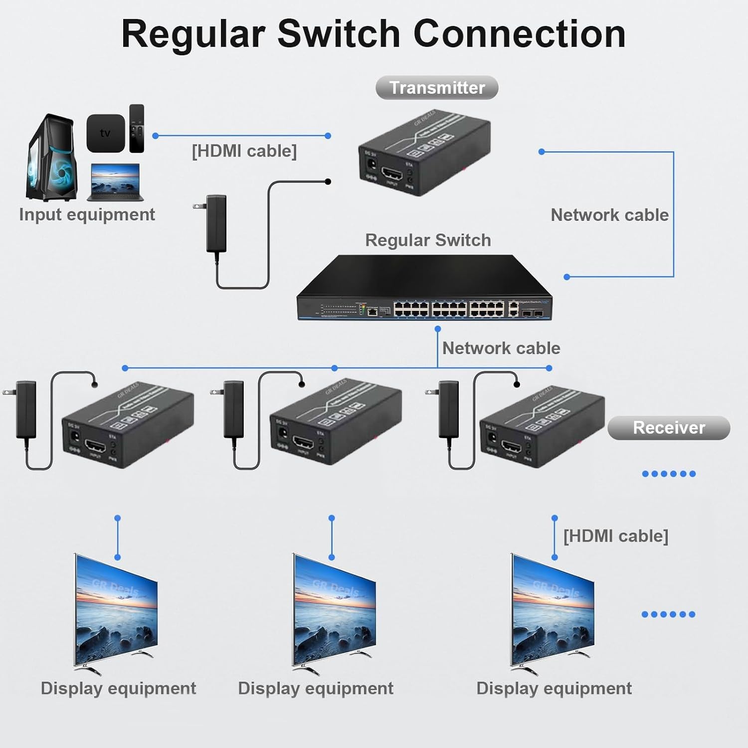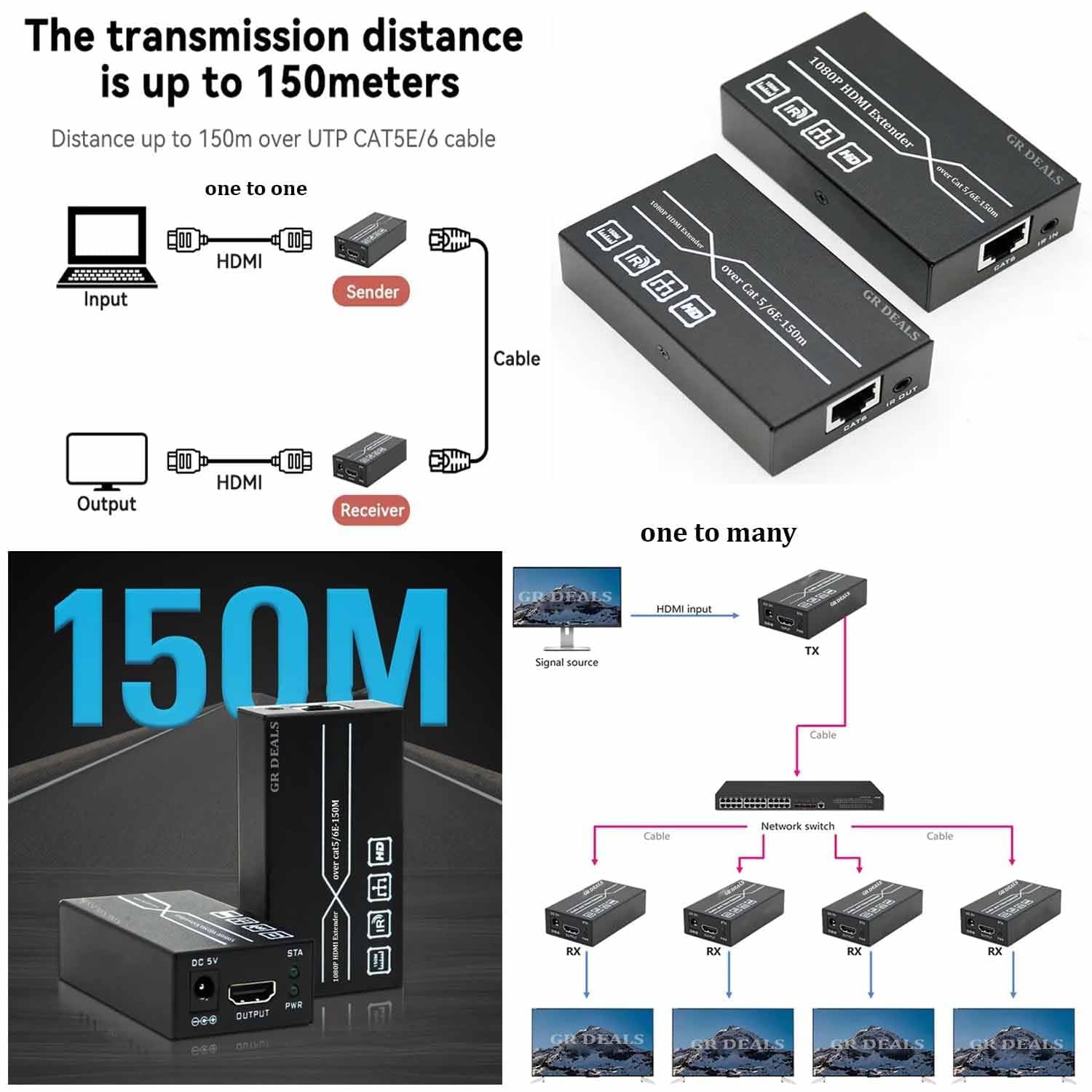 This HDMI Extender includes (TX) & (RX), working as a pair. It allows for transmission and extension full HD 1080p@60Hz HDMI signal via CAT5e/6 UTP network cable, the transmission distance is up to 150meters; Support point to multi-point over Ethernet switch At the same time, the signal is stable.