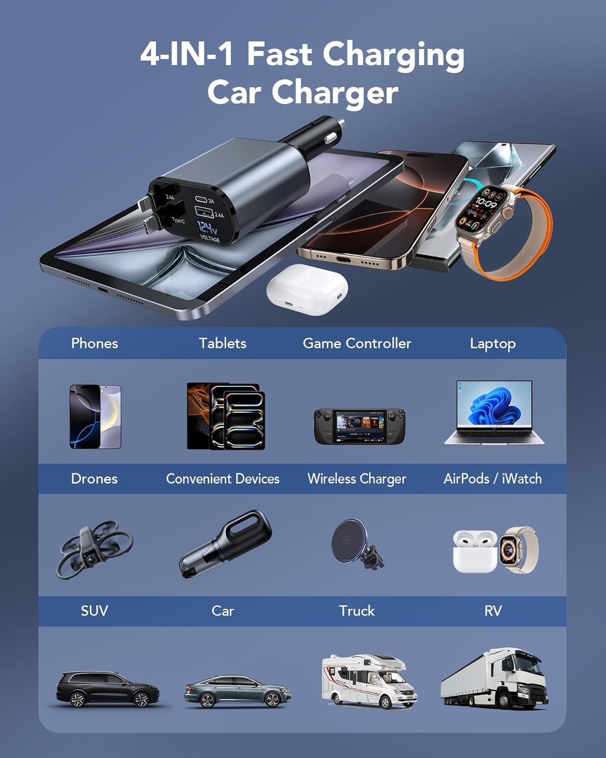 The 4 in 1 Retractable car charger is compatible with the iPhone 16/15/14/13/12 series, making it a versatile choice for iPhone users. Whether you’re looking for a car charger for iPhone 16 Pro Max, iPhone 16 Plus, or earlier iPhone models, this device offers flexible fast charging options. It also supports USB C and USB A devices, ensuring all your gadgets are covered, whether you’re outfitting your truck accessories or looking for unique gifts for car lovers