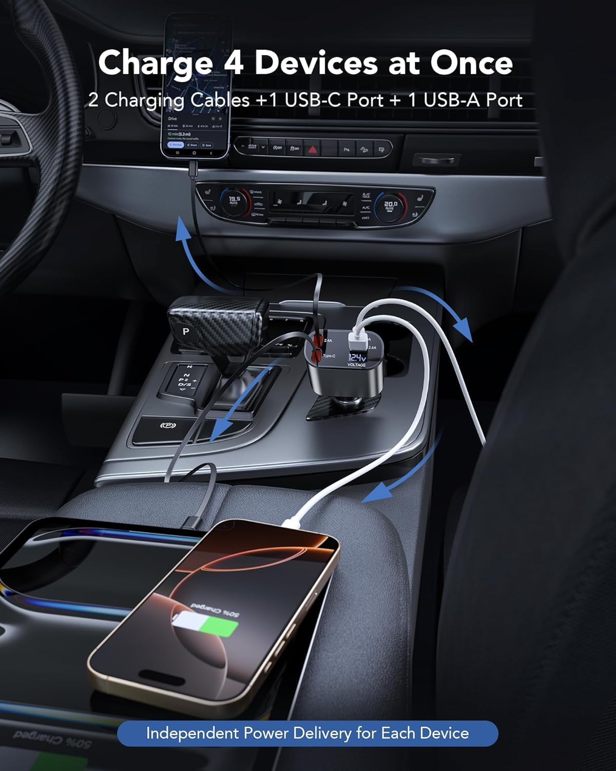 Upgraded 4-1 Fast Charging Solution: With a real PD30W type-C retractable cable(Yellow fast charging port), an IOS retractable cable, and additional USB-C and USB-A ports, this fast charge retractable car charger supports fast charging for up to 4 devices simultaneously. Say goodbye to the hassle of carrying multiple chargers for your different devices.【This car charger is only for charging, and cannot be used for CarPlay】