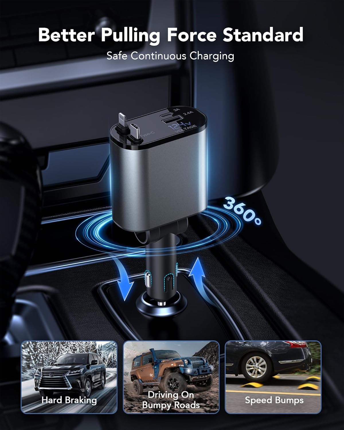 The retractable plug can be adjusted 180 degrees, allowing secure and stable charging even on rough roads—ideal for truck accessories for women or suv accessories for women. This feature is perfect for charging your iPhone 16 Pro Max while driving, ensuring steady power flow in various vehicle setups, whether in a work truck or personal vehicle. Say goodbye to worries about cables coming loose or interrupted charging while on the go.