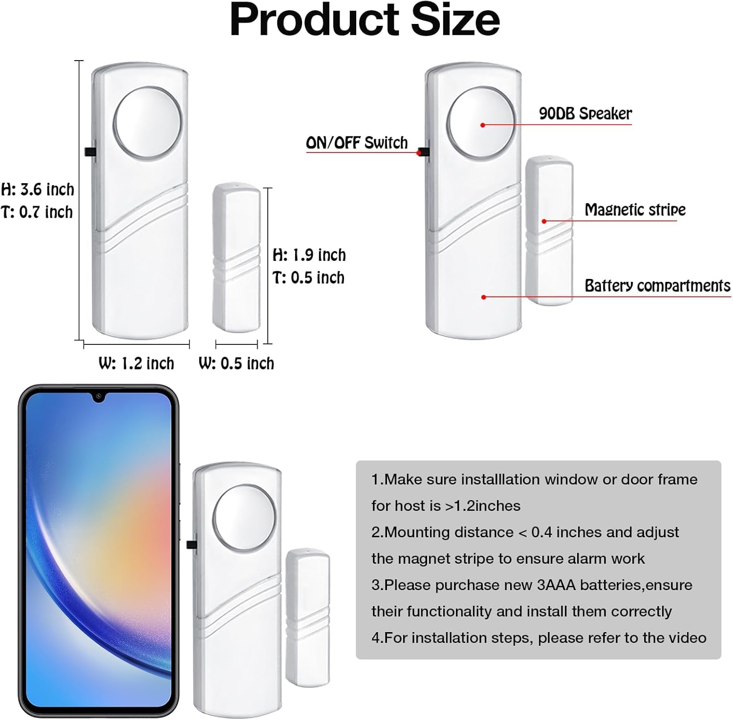 EASY INSTALLATION – Easy stick installation and operation, press on/off switch to power on/off then insert 2 PCS AAA battery (battery do not contain in the box),tear the double-sided adhesive on the back, paste the door knob alarm on your target position. (NOTICE: MAKE SURE THE GAP BETWEEN THE ALARM AND MAGNET PART WITHIN 0.6IN.)