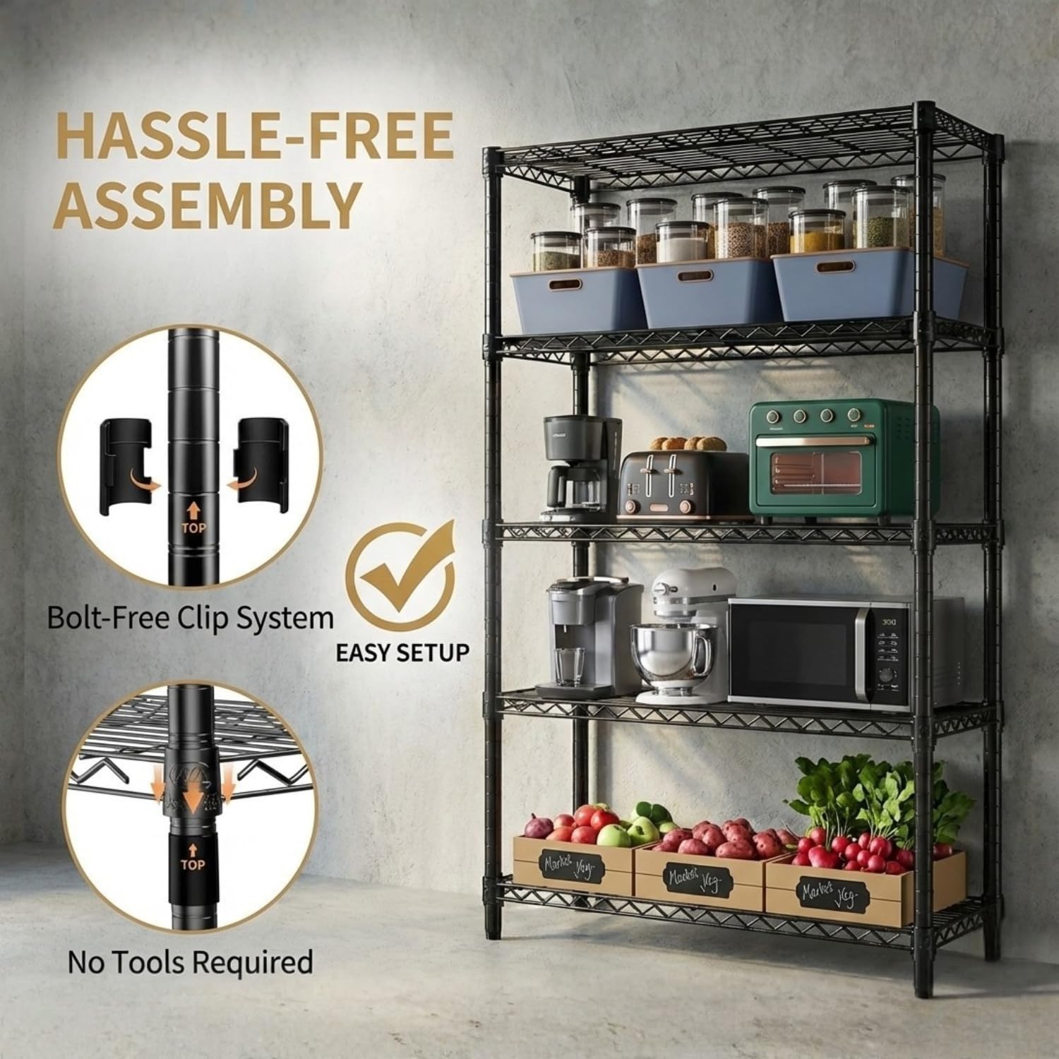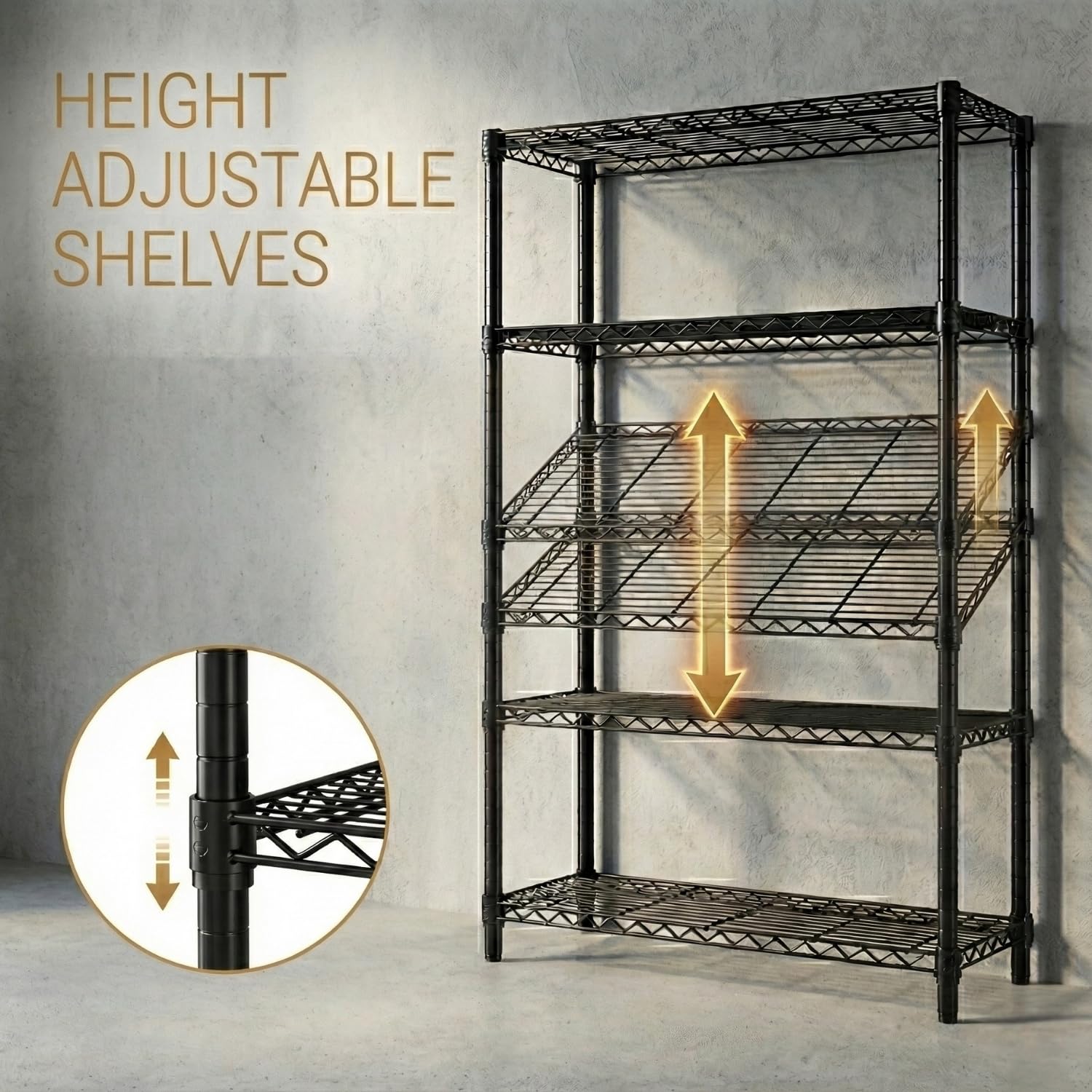 5-Tier Adjustable Shelving: Customize the height between shelves easily to accommodate items of various sizes without tools.