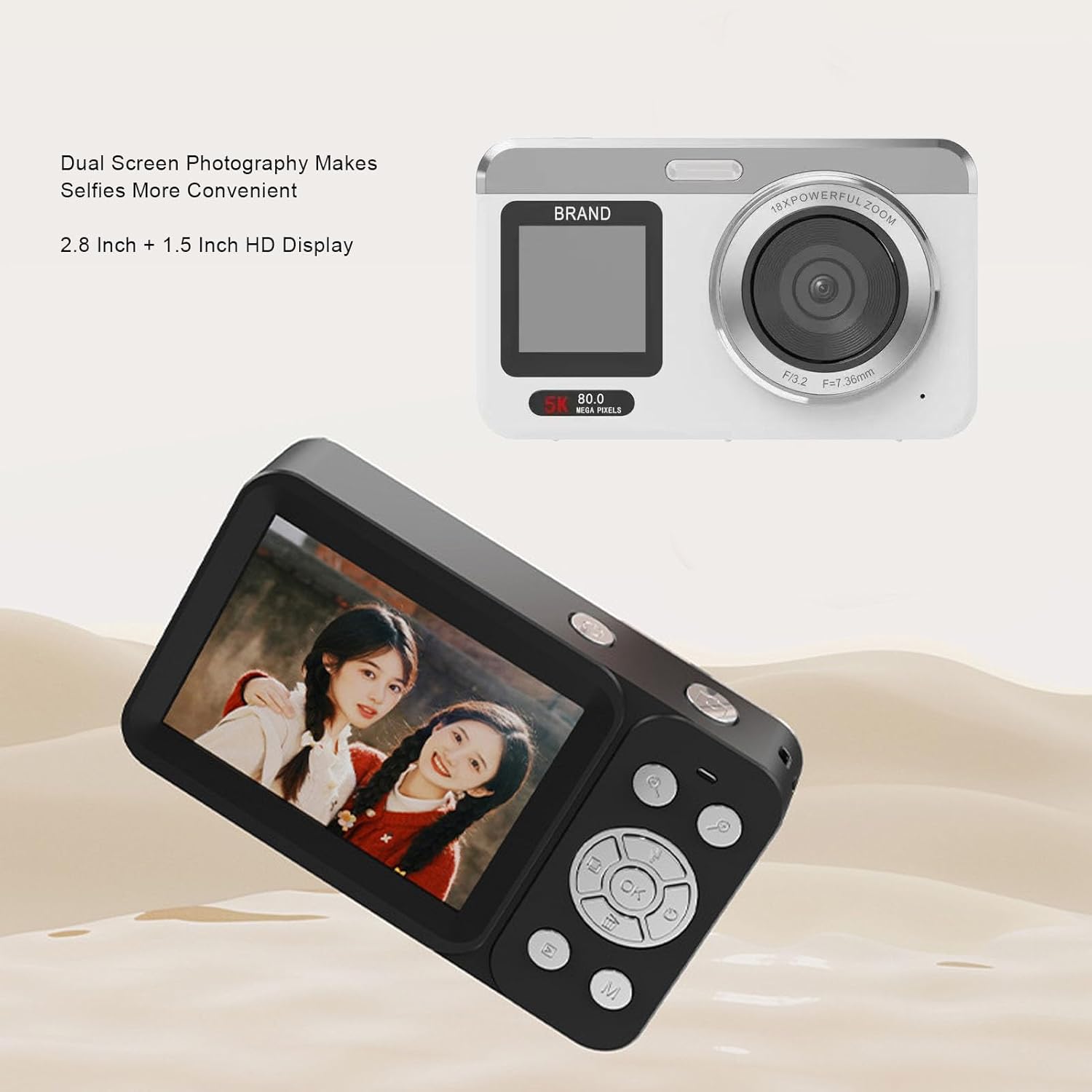 5K 80MP Dual Screen Digital Camera with Autofocus, 18X Digital Zoom & LED Flash for Photography, Compact Vlogging Camera for Travel and Selfies (White)