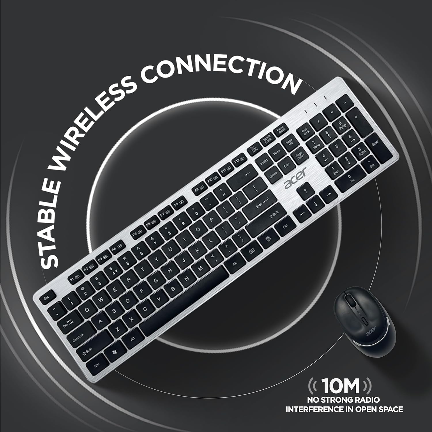 Acer Fusion Wireless Keyboard and Mouse Combo, Durable Stylish Design, 2.4GHz Nano Receiver, 10m Range, Indian Rupee Key, Adjustable DPI (800/1200/1600), Compatible with Windows & Mac (Black & Silver)