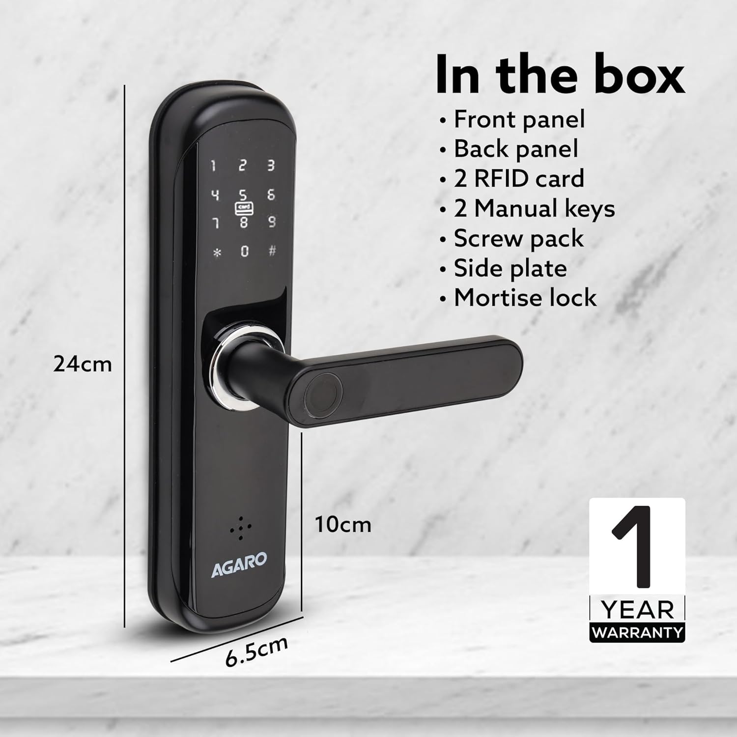 In the Box: Front panel, Back panel, 2 RFID card, 2 Manual keys , Screw pack, Side plate