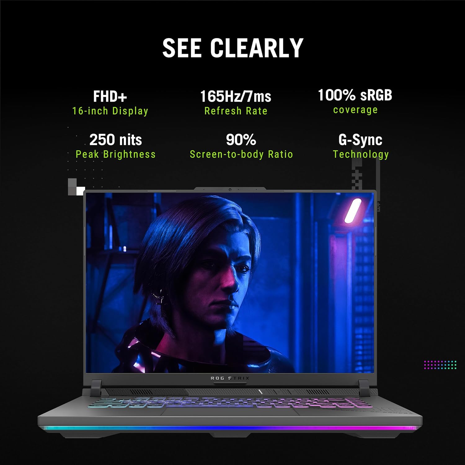 Display : 16-inch, FHD+ 16:10 (1920 x 1200, WUXGA), 165Hz Refresh Rate, 250nits Brightness, 100% SRGB %, Anti-glare display | Keyboard : Backlit Chiclet Keyboard 4-Zone RGB