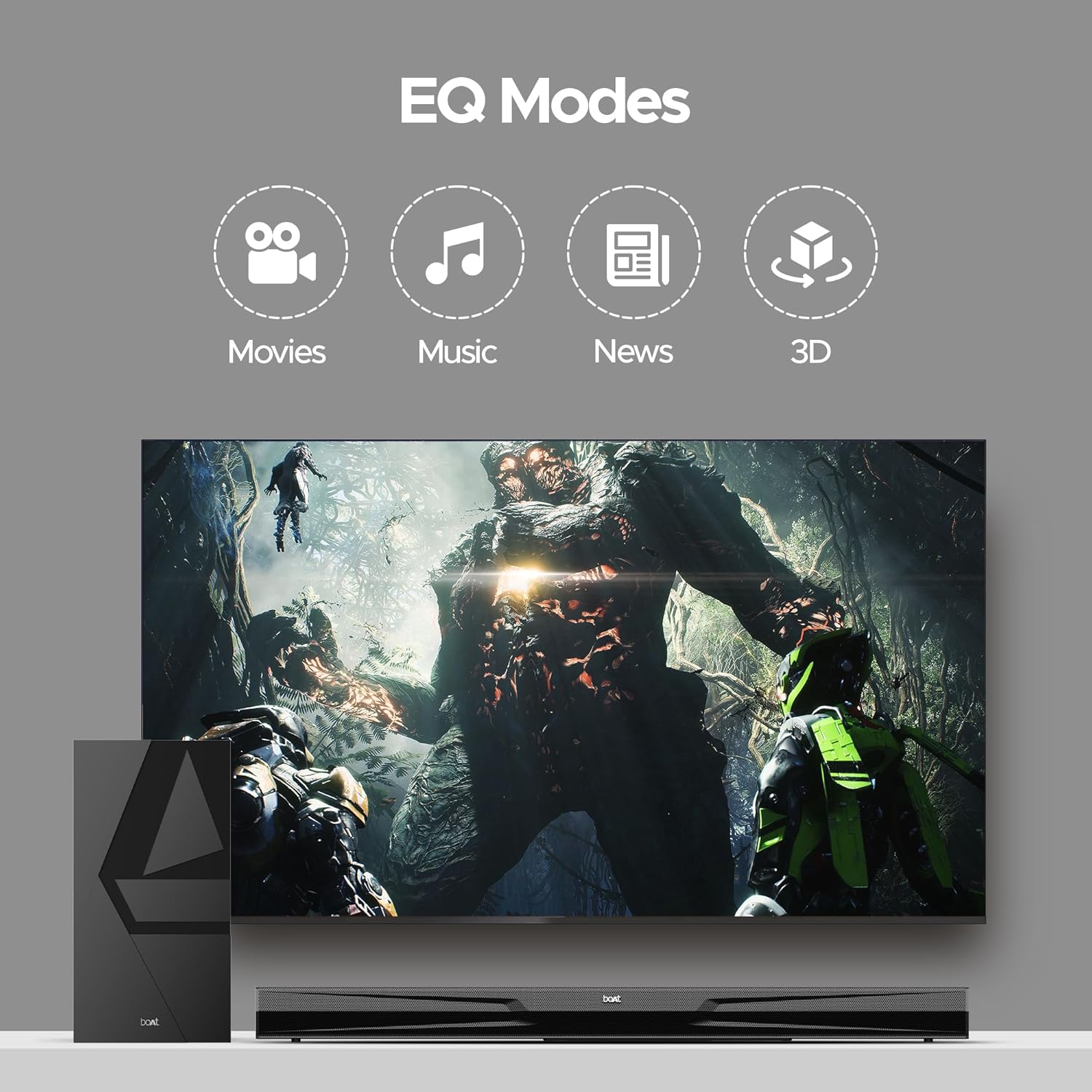 EQ Modes: Dive into tailored audio with this soundbar’s dedicated entertainment EQ modes, like Movies, Music, News, and 3D. Immerse yourself in movies or explore new music albums with powerful sound for company.