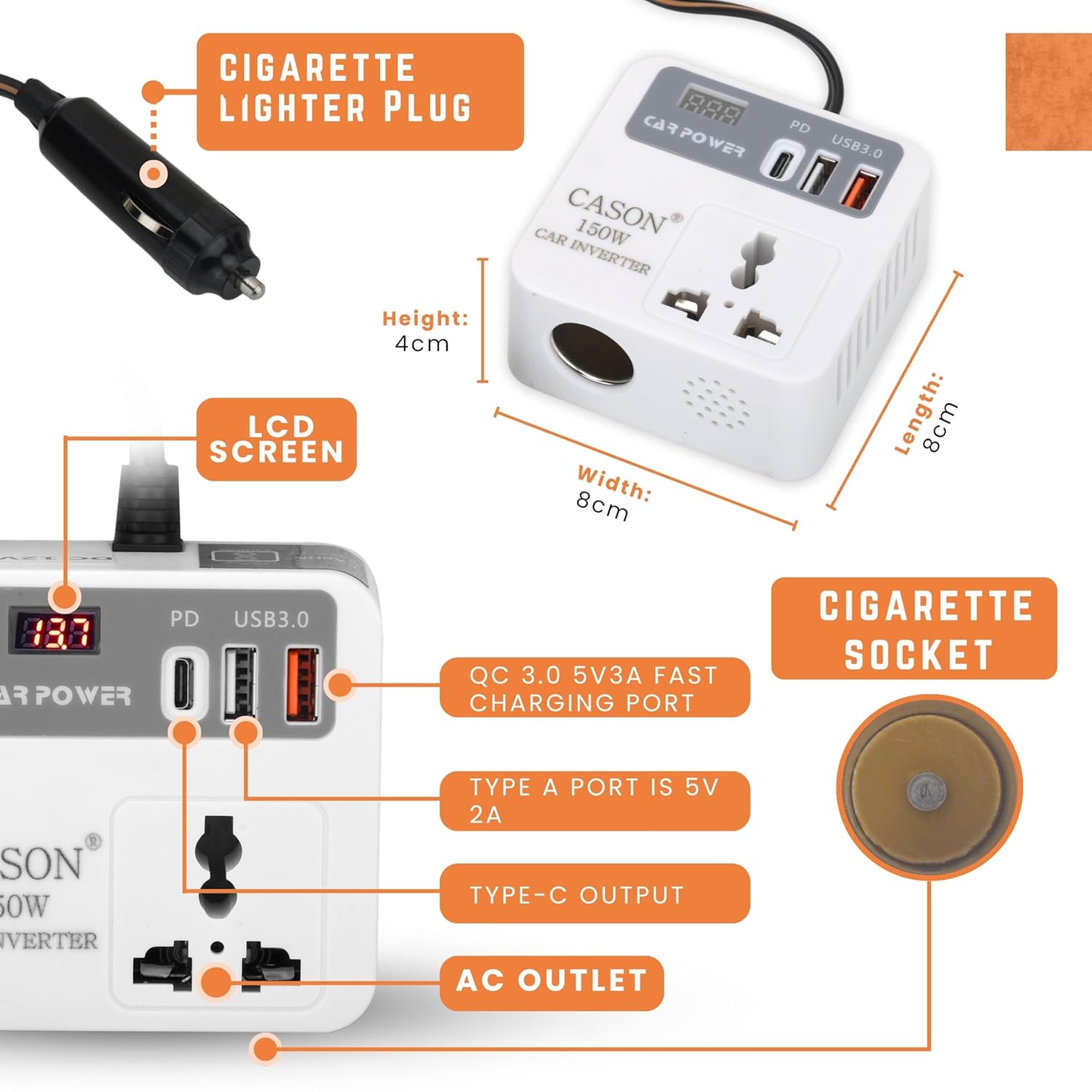 Cason 150W Car Laptop Charger/Power Inverter with 2 USB (3.1A Max) + 1 C Type Smart USB Charging Ports, 12V DC to 220V AC, 2X Universal AC Outlet