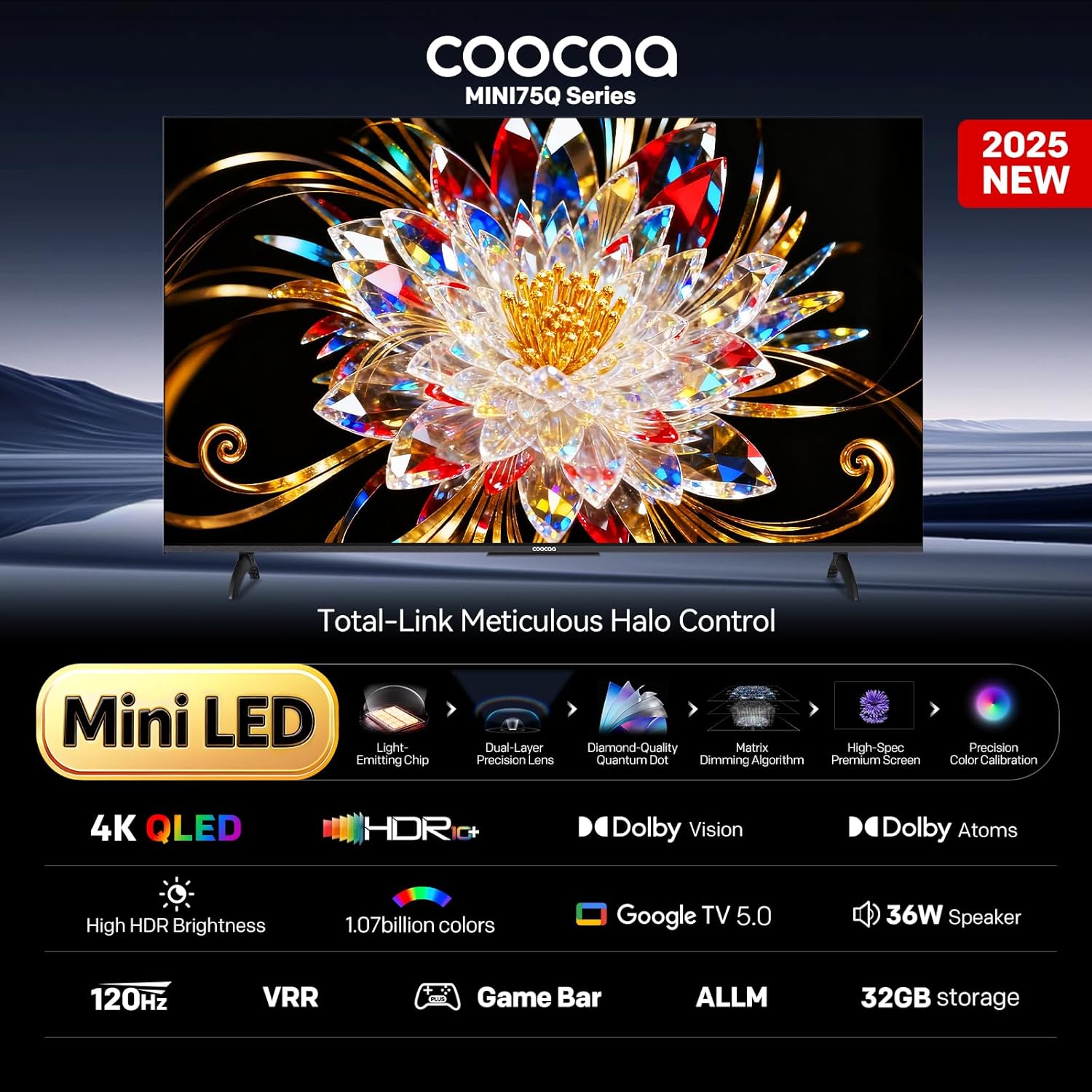 COOCAA Mini LED & QLED technology delivers meticulous halo control with stunning 4K UHD and HDR+ clarity. Enjoy ultra-smooth 120Hz motion, breathtaking Dolby Vision visuals, immersive Dolby Atmos audio powered by 36W speakers, and rich realism with 1.07 billion vibrant colors—for a truly premium cinematic experience.