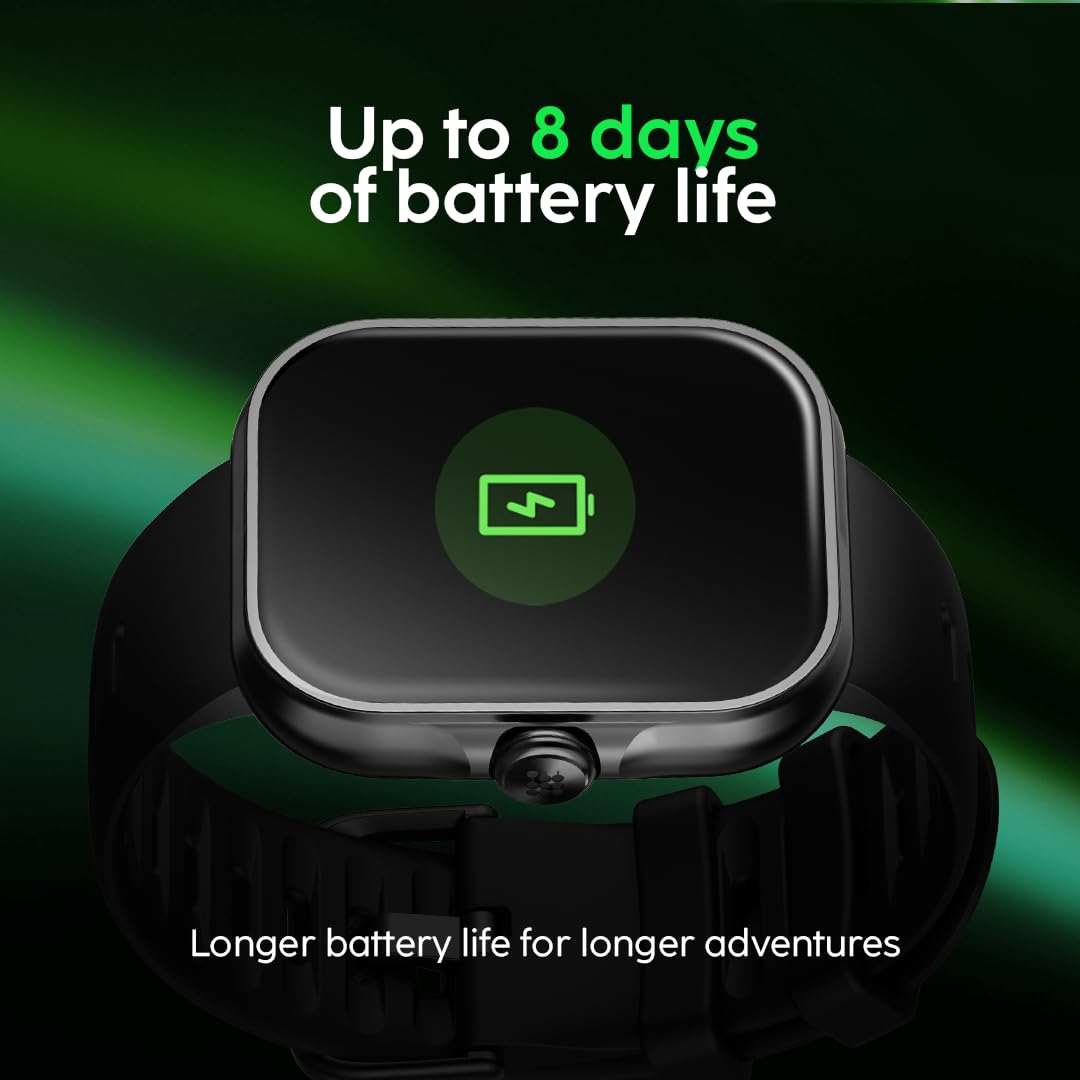Smart Features & Long Battery Life — enjoy Bluetooth calling, smart notifications, offline music with TWS support, and a 300 mAh battery lasting up to 8 days.