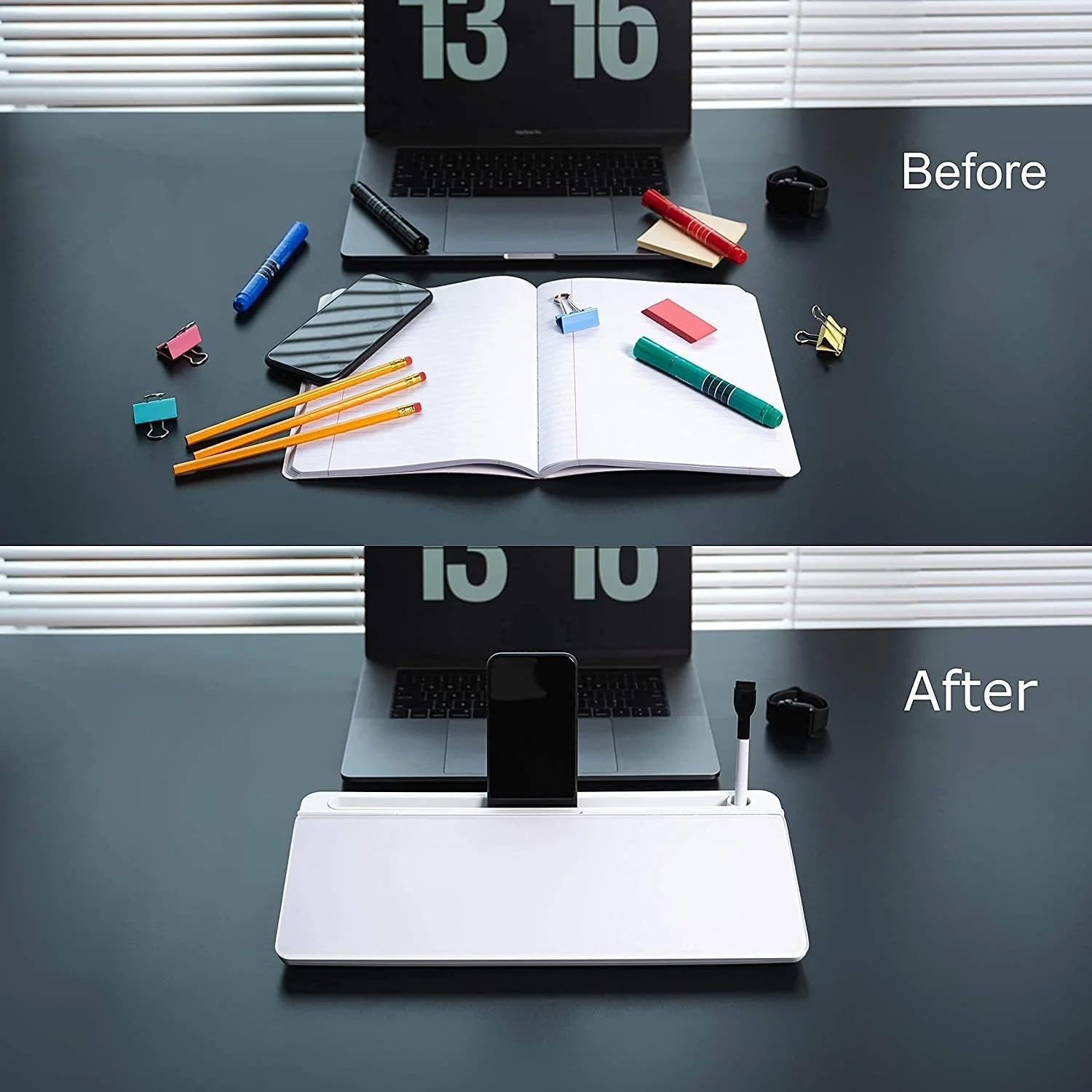 Multi-function – Other than the glass board and built-in storage box, this product also has a slot on the top which can hold a phone or a tablet. And the product itself can serve as a keyboard pad if you need. The study and sleek look also adds style to your desktop.