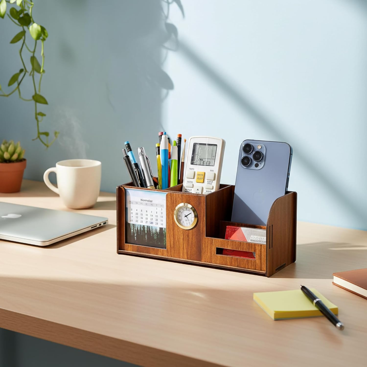 Deskart Desk Organizer With 2026 Calender, Clock, Business Visiting Card And Mobile Holder | Multipurpose Wooden Pen And Pencil Holder Stand For Office & Study Table