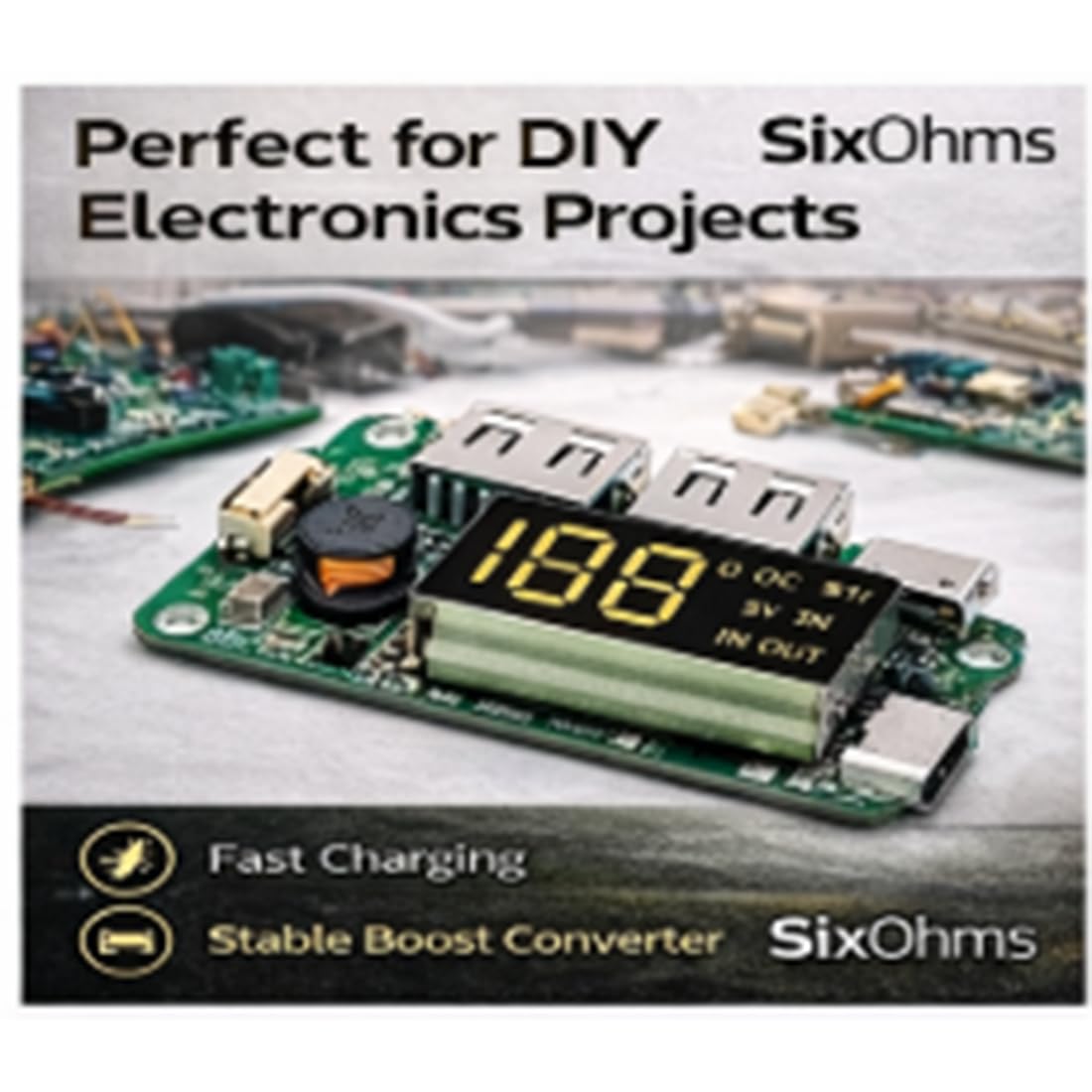 Upgrade your DIY electronics projects with the SixOhms Power Bank Module, a compact and efficient charging solution designed for 18650 lithium batteries. This advanced boost converter PCB allows you to build your own high-performance power bank with dual USB output, LED digital display, and multiple charging input options. Whether you are a DIY enthusiast, engineering student, or electronics hobbyist, this module delivers stable power, smart protection, and professional-grade performance in a compact design. Key Features Dual USB Output (5V 2.4A Max) Charge two devices simultaneously with stable and fast power output. LED Digital Display Real-time battery percentage display helps monitor charging status accurately. Multiple Input Options Supports Type-C & Micro USB input, offering flexible and convenient charging. Boost Converter Technology Efficient voltage boost ensures consistent 5V output from 18650 battery cells. DIY Friendly Design Easy to integrate into custom power bank projects, robotics, and portable electronics.