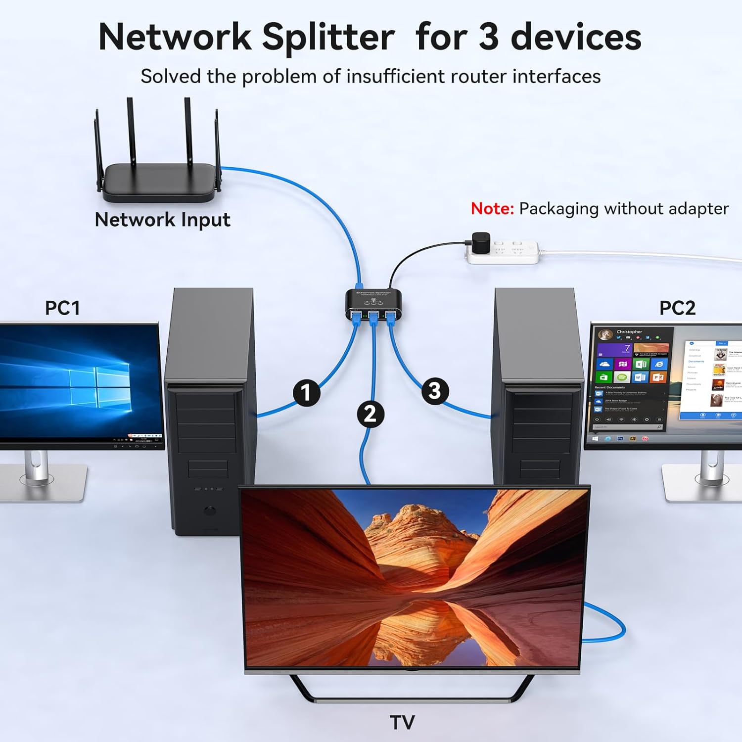 【Ethernet Splitter 1 to 3】This ethernet splitter high speed supports three computers sharing a single Ethernet line at the same time and is designed to solve connectivity problems caused by insufficient cabling. Powered by the included USB cable, it is a simple and efficient internet splitter that helps you expand your network ports and provides an ideal solution to connectivity problems. Note: Power must be supplied during use.
