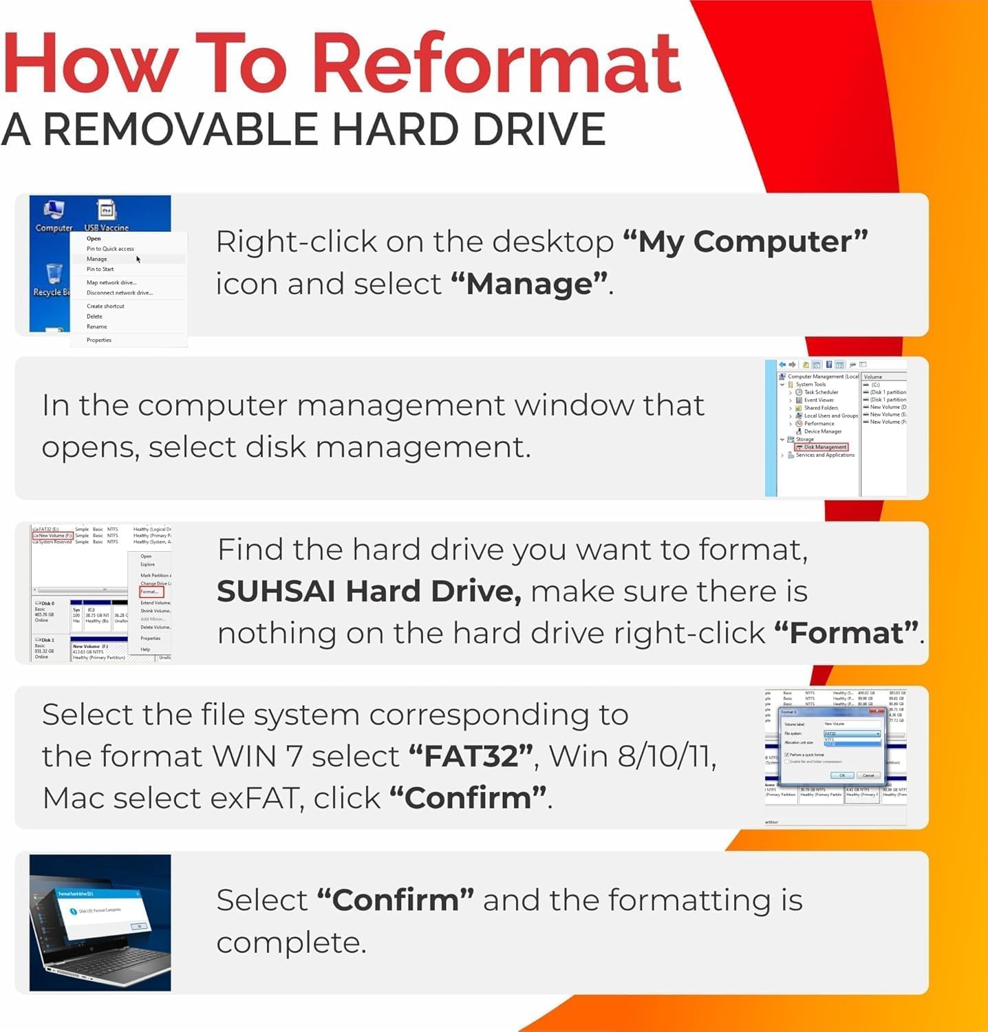 Note: If you encounter compatibility issues with the factory formatted file system on your hard disk, consider reformatting it following the steps in the image. This ensures better alignment with your computer’s operating system, allowing for smoother functionality. What’s Included: 1 X Portable Hard Drive, 1 x USB 3.0 Cable, 1 x User Manual.