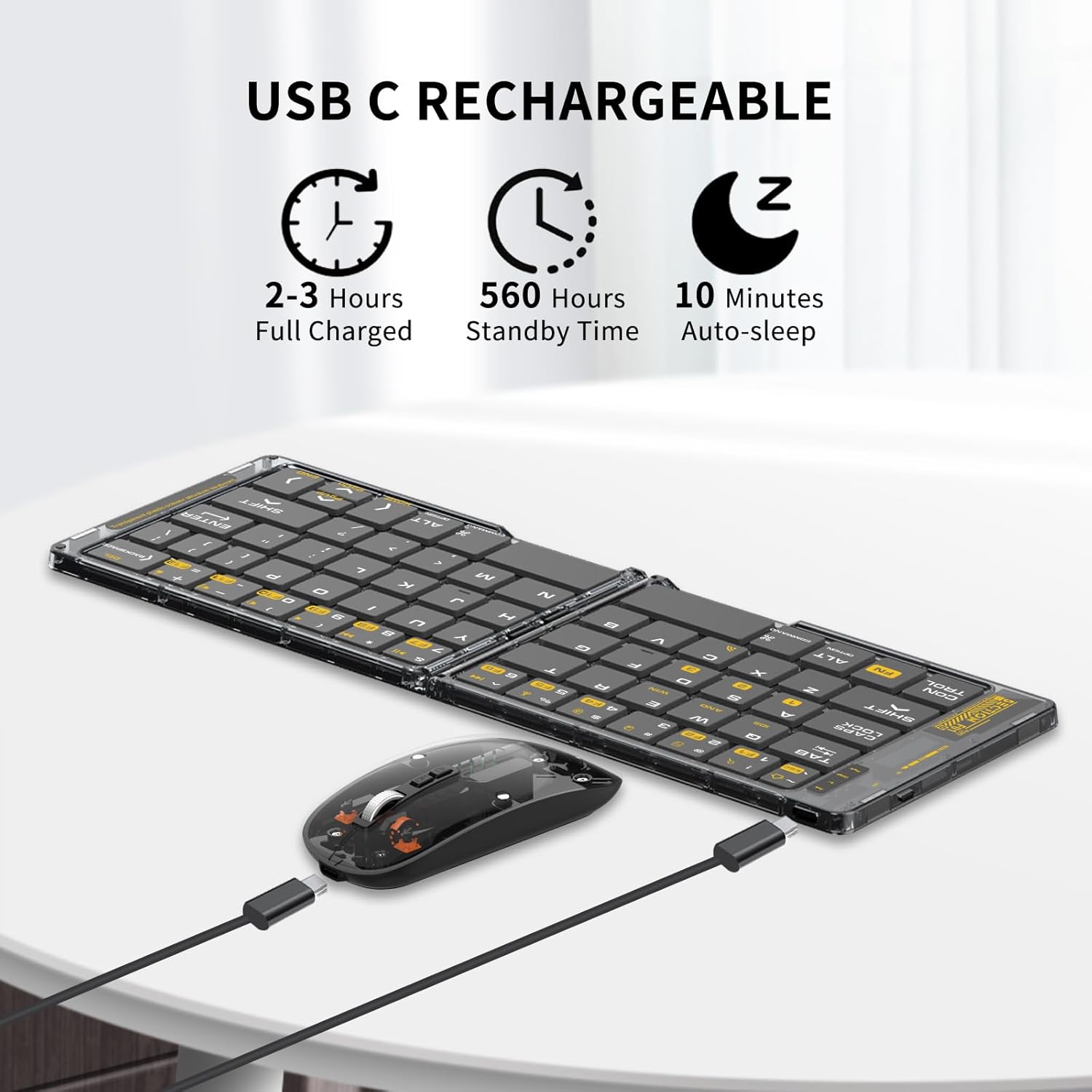 Unique Appearance: The Bluetooth keyboard and mouse combo features a unique transparent body design, allowing the internal structure to be visible at a glance. The keyboard’s surface is covered with leather, which helps prevent dust buildup and minimizes fingerprints, giving the overall keyboard a more premium feel. The metal hinge enables smooth folding of the keyboard. The transparent plastic mouse is crafted using patented technology and comes with a device stand, a Type-C charging cable, and more. This compact and portable Bluetooth keyboard and mouse set is ideal for travel, business, study,etc.