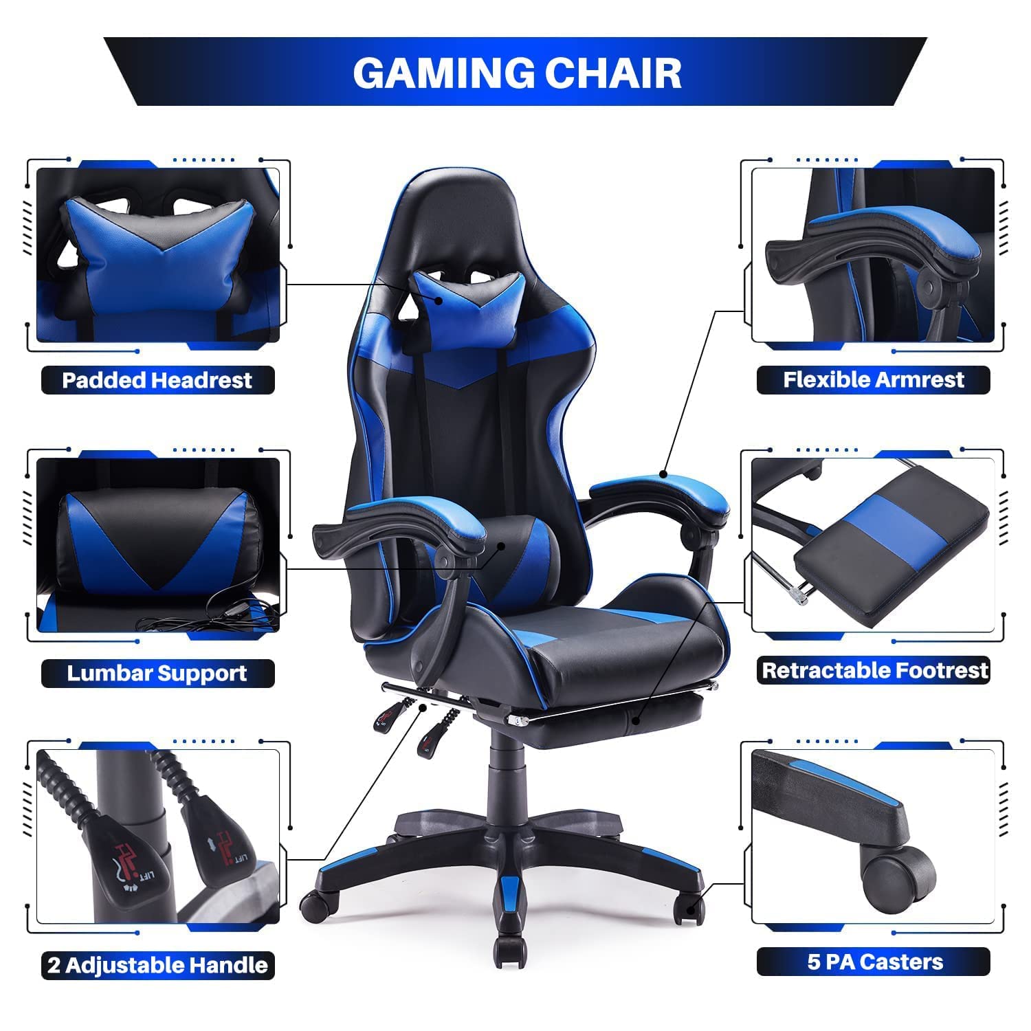 PREMIUM MATERIAL AND HIGH STABILITY: Covered with high QUALITY PU leather, the gaming chair is wear resistant and easy to clean. The Class-3 gas lift certified by SGS provides the gaming chair stable seat lifing function.The heavy-duty metal base (360-degree swivel) with 5 smooth-rolling PU caster wheels makes a Sturdy structure that ensures the moving chair moving stably and smoothly. (Maximum weight capacity: 250 lbs).