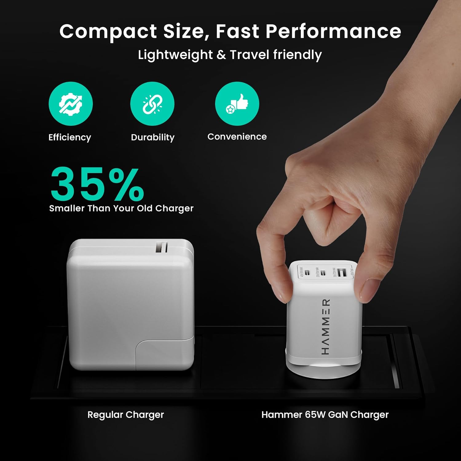3 Fast Charging Ports: Experience threefold charging brilliance, along with speed and convenience on a Hammer 65w charger equipped with 2 type-C and 1 USB A port. Charge your devices faster than ever before, ensuring minimal downtime, catering to a wide range of devices, and ensuring compatibility