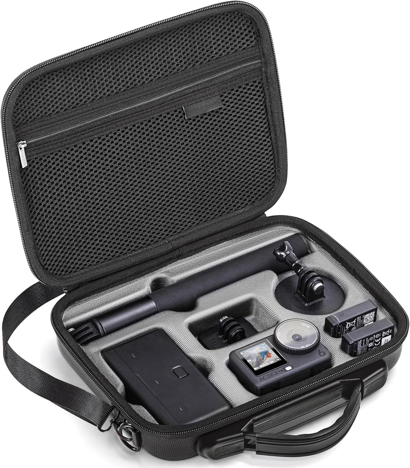 【Large Capacity】It is capable of holding a 1*Osmo Action 6 camera with horizontal vertical Protective Frame, 1*Osmo 1.5m extension rod, 1*Multifunctional Battery Case and 3 Extreme Battery, 2*Osmo locking screw,1*Flat Adhesive Base, 2*Quick-Release Adapter Mount, cables, SD cards, iPad mini and many other Camera accessories.