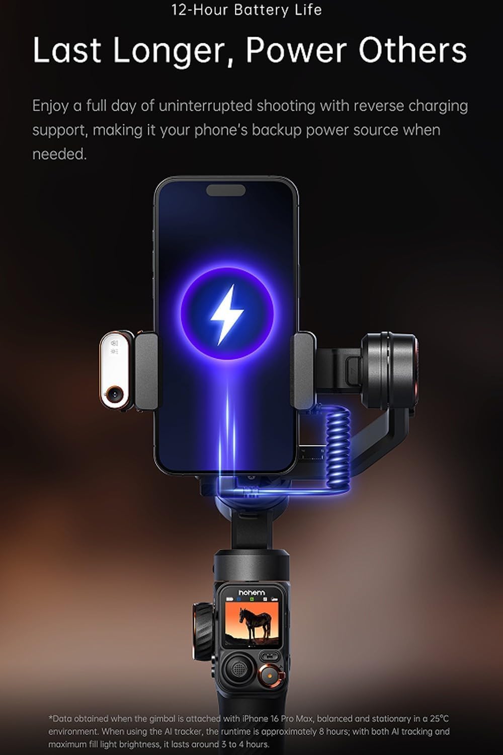 You can enjoy an entire day of uninterrupted shooting thanks to its 12-hour battery life. With reverse charging support, it can serve as your phone’s backup power source