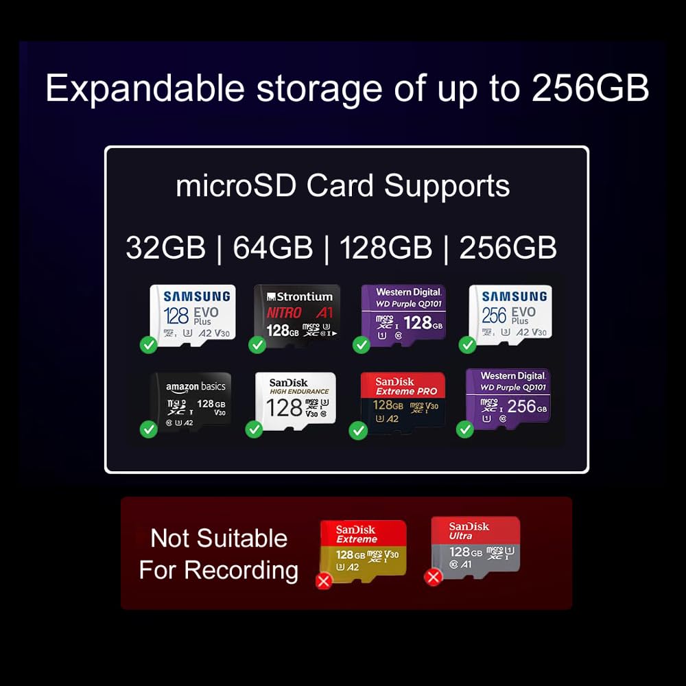 – SD Card Support: Minimum 16GB – Maximum 256GB (SD Card not included in package)