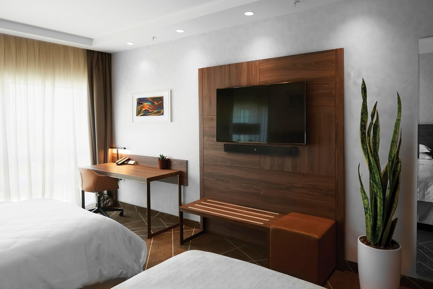The JBL Professional Pro SoundBar PSB-2 is a commercial grade 2.0 channel soundbar, designed specifically for hotel rooms, cruise staterooms, meeting spaces, and classrooms. As an evolution in sound bar technology, it is designed to deliver focused room audio while minimizing sound transfer to neighboring rooms. Tuned specifically for the human voice, the PSB-2’s front-facing speaker delivers significantly improved fidelity through internal TV speakers. Enhanced clarity at low volume levels also ensures users can hear clearly without needing to unnecessarily increase volume and possibly disturb other rooms. A 2-position volume limiter switch adds additional volume limiting capability. To support the most popular sources, HDMI and Bluetooth digital inputs are included, and a single source control button on the top of the speaker makes switching between sources easy. For applications requiring analog only input needs, the JBL PSB-1 soundbar is also available. Automatic Bluetooth pairing management and the ability to update the Bluetooth name of each PSB-2 can be useful when managing multiple PSB-2s. With professional-grade materials and construction, the PSB-2’s durable exterior is designed to withstand the rigors of everyday commercial use, but is also easy to clean. To prevent tampering, a locking plate is available to hide an available service port. With commercial-quality features; room-centric sound, even at low volume levels; and simplified digital connectivity, the JBL PSB-2 creates an efficient and cost-effective commercial soundbar solution that’s perfect for a wide range of hospitality, corporate and education professional needs.