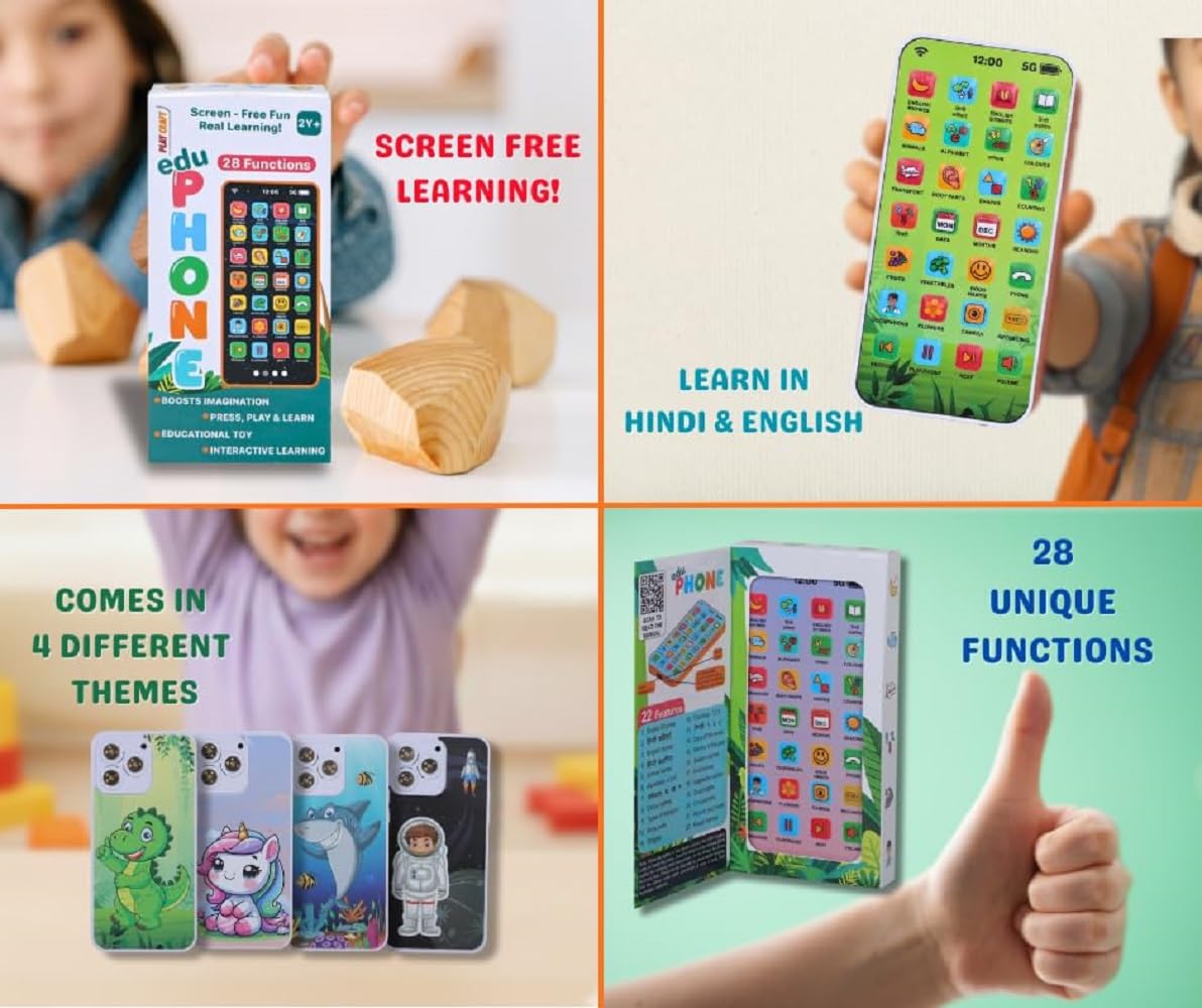 Kids Educational Toy Phone with Hindi & English Learning, 28 Functions, Rhymes Stories Alphabet Numbers Animals Sounds, Play Phone Toy for Children (4 Theme Designs)