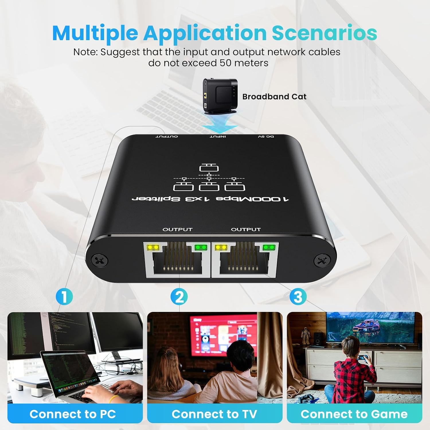LAN Splitter 1 to 3, 1000Mbps Gigabit Ethernet Splitter [Network 2 Devices Simultaneous], RJ45 LAN Network Splitter with USB-C Power Cable for Computer, Hub, Switch, Router, ADSL, Digital TV, etc