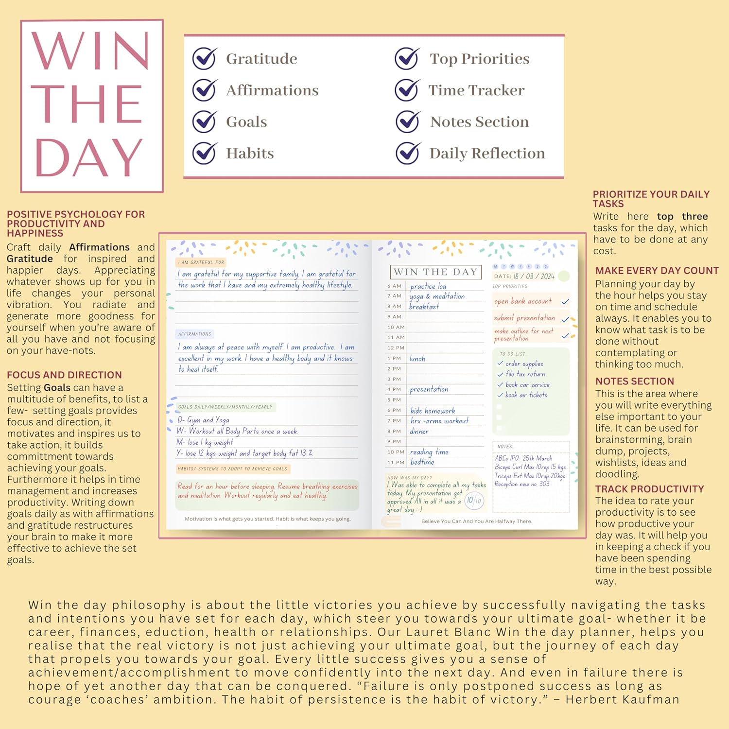 Perfect Gift Idea: A thoughtful and inspiring gift for yourself or your loved ones. The LAURET BLANC Win the Day Planner is a meaningful way to encourage growth, positivity, and success—making every day more intentional and fulfilling.