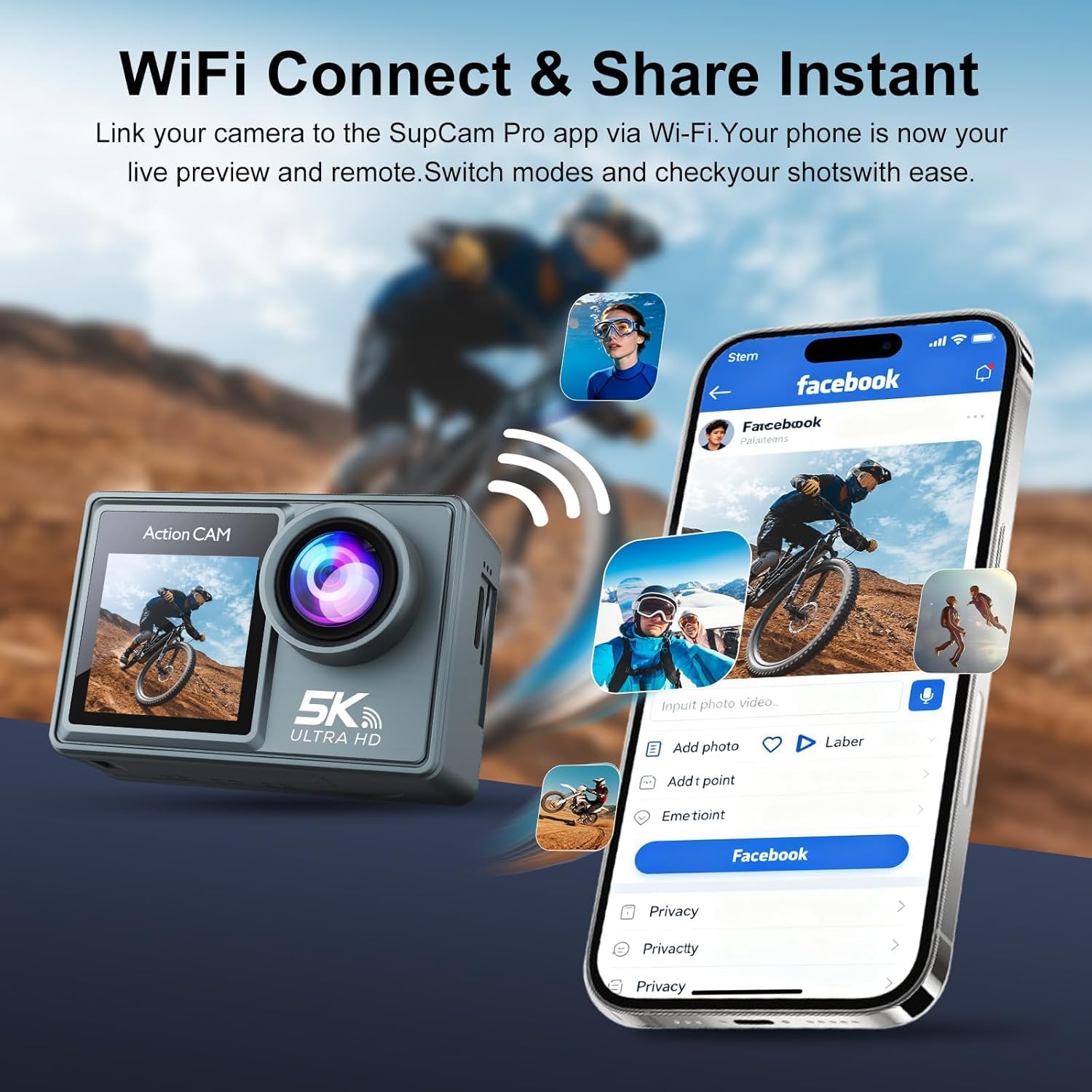 The Underwater camera features built-in Wi-Fi connectivity with a 10 meter range ,enabling instant sharing of memorable moments via the APP. The waterproof case supports shooting at depths of up to 30 meters. Equipped with a high-sensitivity touchscreen and physical buttons, it offers smooth control. Ideal for shooting in water or wet environments such as swimming, diving, surfing, rafting, skiing, and sports rain activities, letting you enjoy your adventures to the fullest