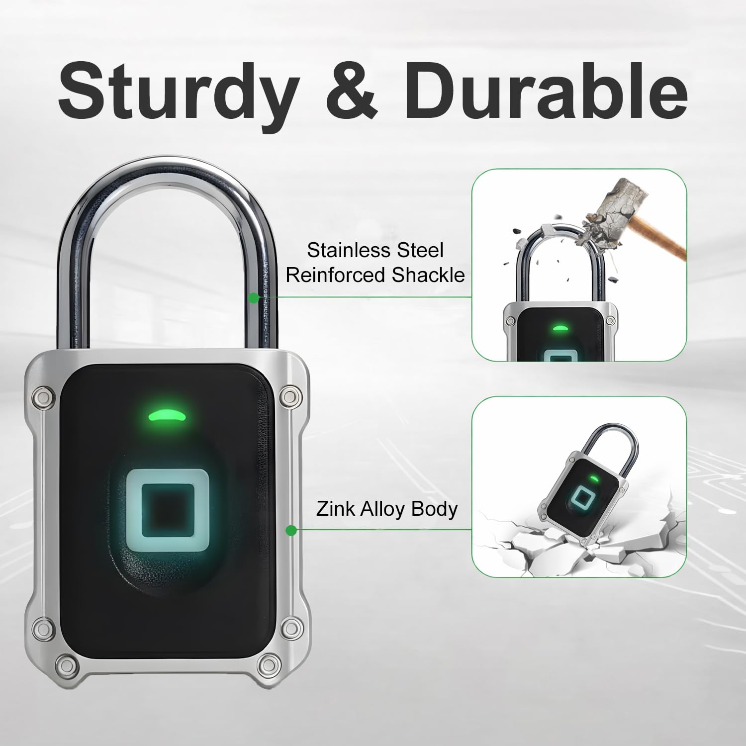LAVNA Smart Fingerprint Padlock with 2 way of access, Fingerprint, Mobile app access. You can unlock it via LAVNA Smart Life mobile app too with in the bluetooth range (4-5 M). You can also check past unlocking records in the mobile app. The fingerprint lock can store 10 sets of fingerprints, allowing multiple fingers or users to access it simultaneously. Strong Waterproof Performance: With an IP67 waterproof rating, this keyless lock can operate reliably even in rainy conditions. Sturdy and Durable: Constructed with high-quality materials including zinc alloy, ABS, and 304 stainless steel, featuring a thick lock hook for enhanced security level 6. Versatile Application: Specially designed for Main doors and also Suitable for bags, suitcases, cabinets, warehouse doors, dormitory doors, and construction site doors. Long-Lasting Battery: Includes built-in battery, works for approx 4 month. In case complete battery drained out you can also easily change the button type 2 cells and unlock it with your registered fingerprint.