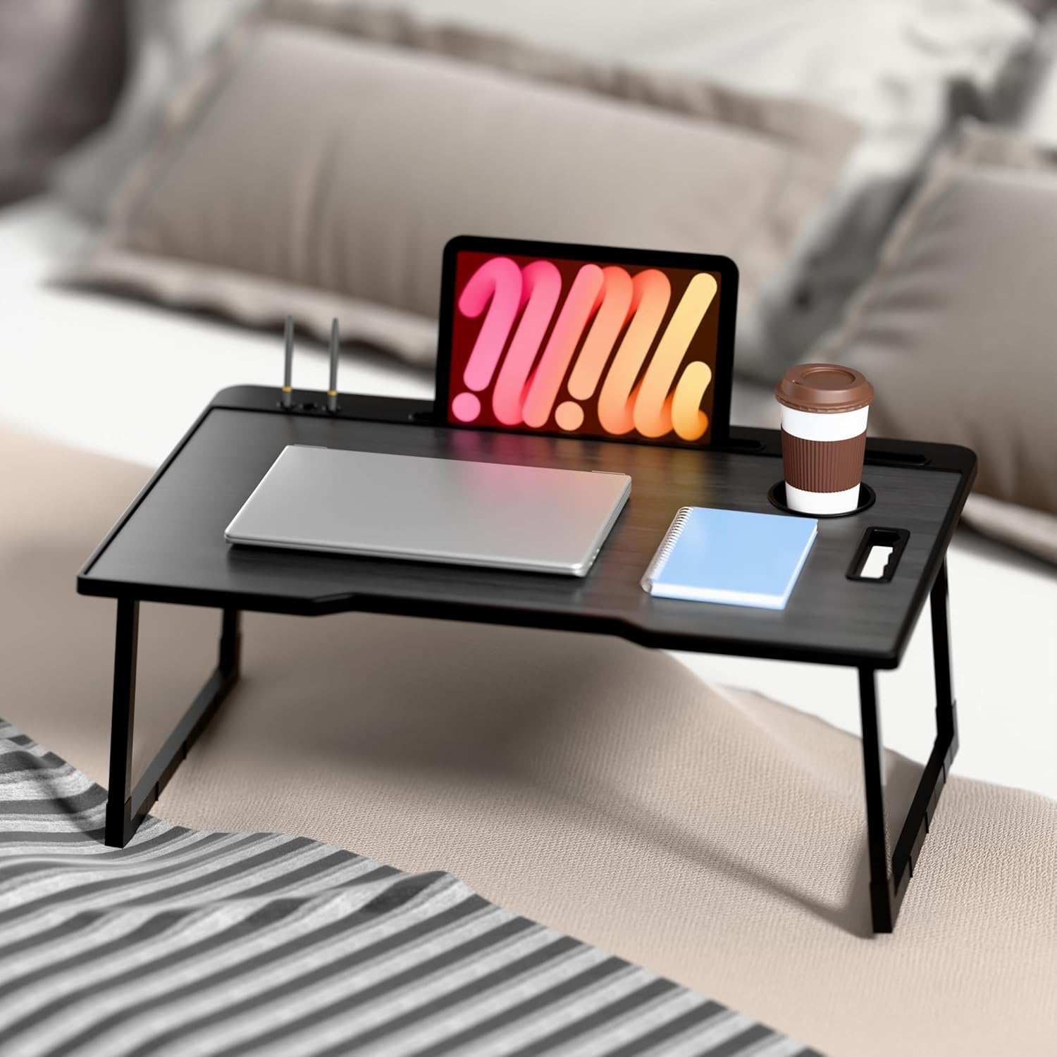 LIDBOX Smart Multipurpose Foldable Laptop Table with Cup Holder, Study Table, Bed Table, Breakfast Table, Foldable and Portable/Ergonomic & Rounded Edges/Non-Slip Legs (COT BLACKK)
