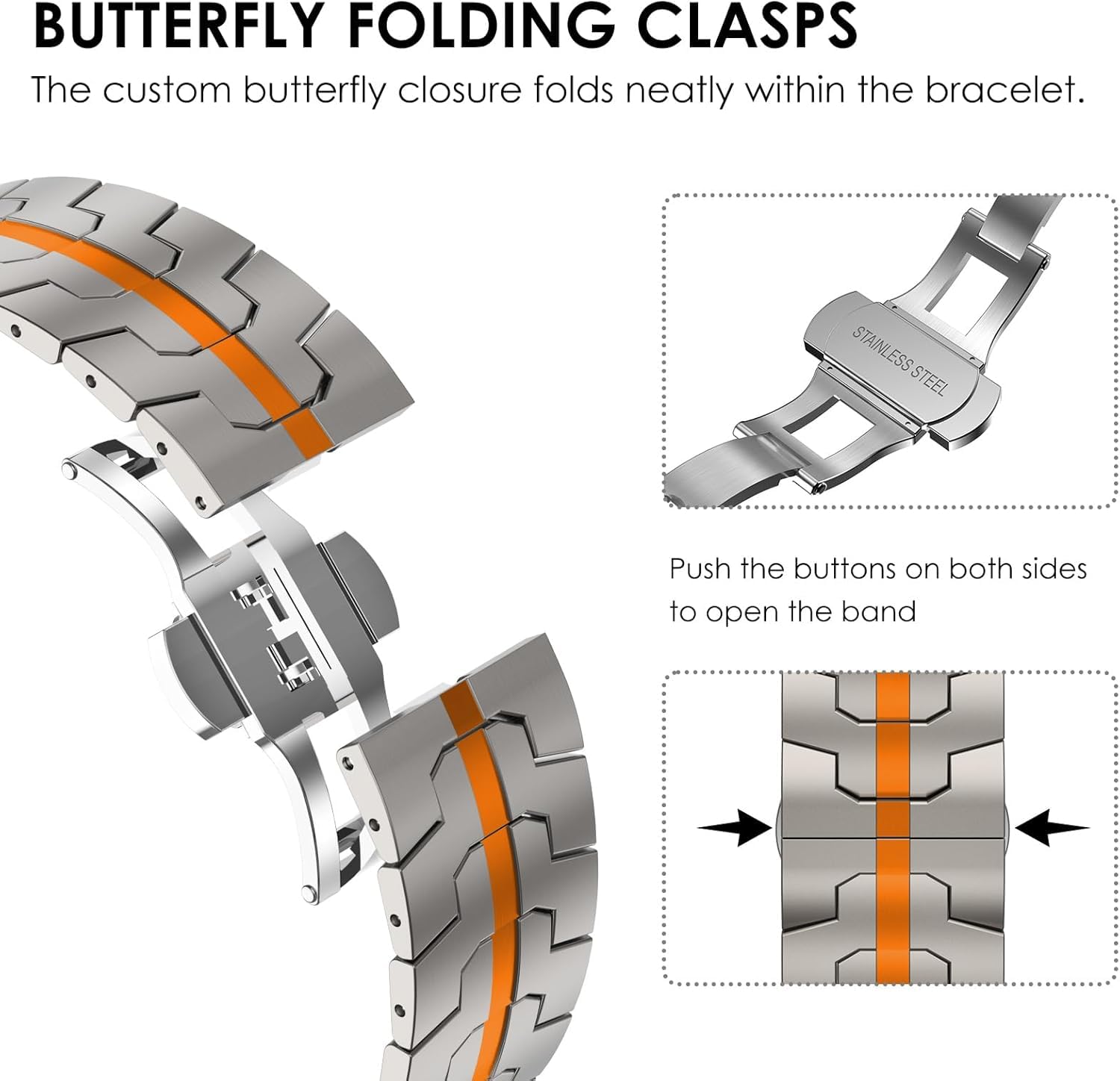Metal Stainless Steel (No Gap) Strap with Butterfly Folding Clasp Compatible with Samsung Galaxy Watch 7/8 Ultra/Ultra 2 Band 47mm (2024/2025) – Silver|Orange [Watch NOT Included]