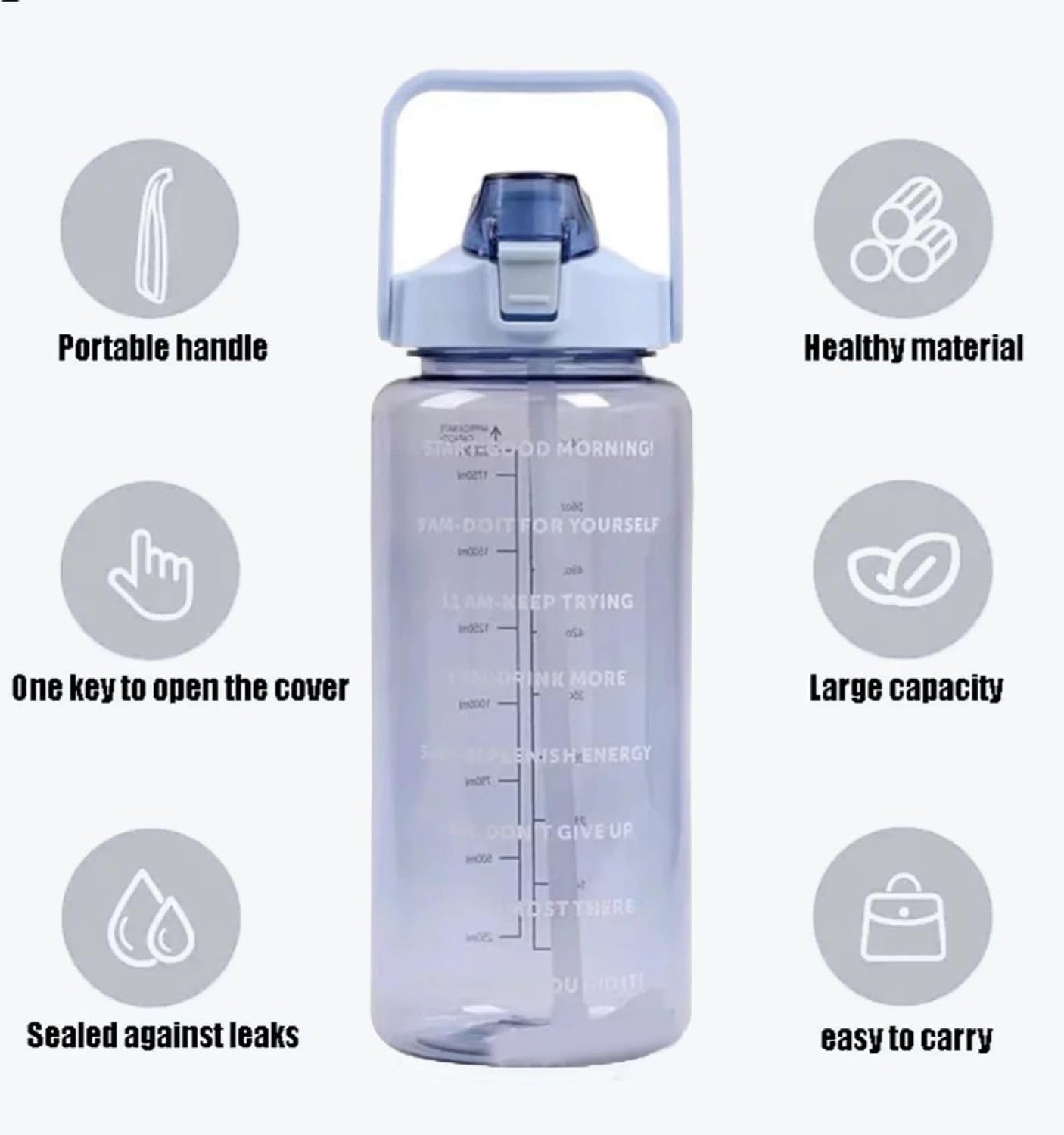 Achieve your daily hydration goals with this 2 Litre Motivational Water Bottle with Time Marker. Designed with hourly time markings, it reminds you to drink water regularly and stay healthy throughout the day. Made from premium BPA-free plastic, this bottle is durable, lightweight, and safe for daily use. The leakproof flip-top lid with secure lock prevents spills, while the built-in straw allows easy drinking on the go. Its large 2 litre capacity makes it perfect for gym, fitness, office, school, travel and outdoor activities. Available in stylish multicolor gradient designs, this bottle is both functional and fashionable.