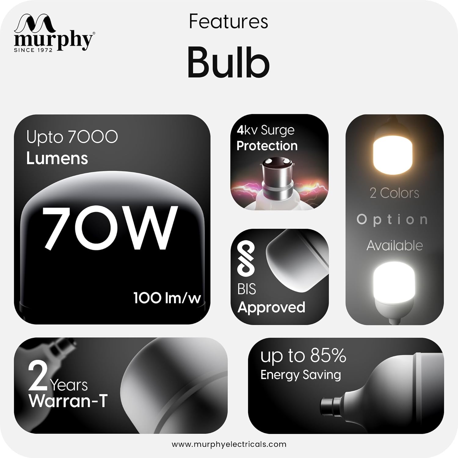 Murphy 70W LED Bulb – Cool Daylight | High Wattage Energy-Saving Bulb | B22 Base | Long Life | 6500K Bright White | 2-Year Warranty (Pack of 1)