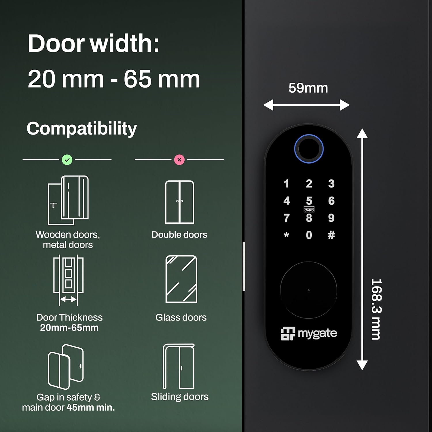 Mygate Smart Lock Edge is an ultra‑compact, versatile smart rim lock tailored for Indian homes. Designed to fit wooden, metal, and doors with safety grills (thickness ≥ 25 mm), it requires minimal drilling and offers six unlocking options—Fingerprint, PIN, RFID, App, OTP, and Manual Key. Its sturdy aluminium alloy body and strong deadbolt withstand dust, light, and humid conditions. The magnetic sensor of the lock auto-locks the door whenever the door is closed. It comes with tamper‑freeze protection after multiple failed attempts. Schedule recurring and timed access for staff and daily helps and review detailed unlock logs on the Mygate Smart Devices App via Sync in BLE range. Expand functionality with the optional Wi‑Fi Gateway to unlock remotely, get instant notifications on unlock, and provide remote access to guests just via tap (no OTP sharing required). Powered by 4 AA batteries lasting over 6 months, plus low‑battery alerts and emergency USB jumpstart, it ensures reliability even if you miss the alerts. Supported by a 2‑Year Brand Warranty, 10‑Year Service Guarantee, and free professional installation (or easy self-installation via video guides), Mygate Edge offers peace of mind through smart convenience, robust design, and long-term reliability. smart door lock, fingerprint lock, Biometric Lock, Mygate smart lock, digital lock for home, app-based lock, keyless entry, wifi door lock, metal door smart lock, wooden door lock, RFID lock, compact smart lock, digital fingerprint door lock