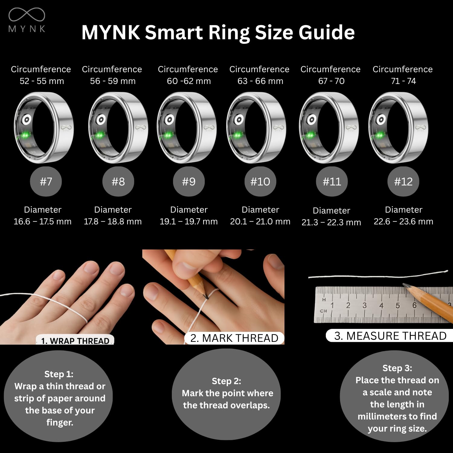 Track Smarter. Live Better with the MYNK Alpha Smart Ring. Stay ahead of your health with the MYNK Alpha Smart Ring — a lightweight, stainless steel wearable that redefines how you monitor fitness and wellness. Unlike bulky smartwatches, this sleek smart ring is designed for 24/7 wear, offering advanced health tracking in a minimalist form. Engineered with premium stainless steel and built for comfort, MYNK Alpha delivers step and calorie tracking, sleep monitoring, stress insights, and advanced vitals like heart rate variability, blood pressure, and blood oxygen. With IP68 waterproof protection, the ring is resistant to sweat, rain, and everyday splashes, making it perfect for workouts, sleep, and beyond. Plus, it’s fully compatible with Smart Health and Apple Health, allowing you to sync and manage your data with ease. Ideal for both men and women, stylish enough for any occasion, and smart enough for every goal. Choose MYNK Alpha — where smart meets subtle. Wear your wellness with confidence and convenience.