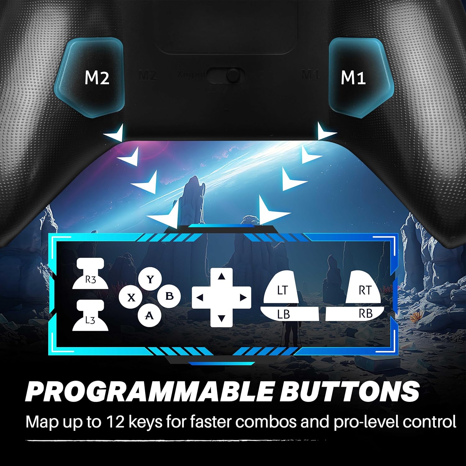 CUSTOMIZABLE BUTTONS & TURBO: M1/M2 back buttons support up to 12 programmable functions; “T” button enables TURBO and AUTO TURBO modes for rapid fire in shooting and action games