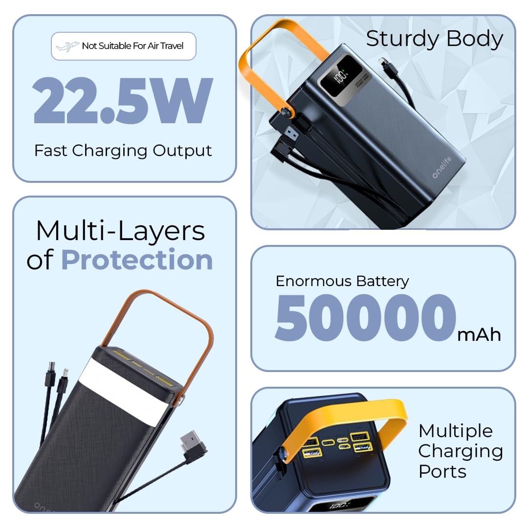 Onelife 50000mAh Power Bank with 22.5W Fast Charging, 7 Outputs, Built-in Cables, LED Light, Digital Display – Not for Air Travel