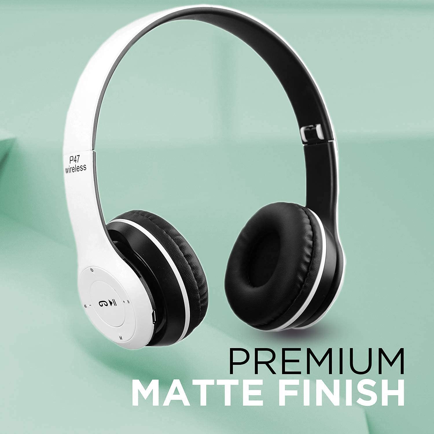P47 wireless headphone Aesthetic Design, Precise Sound Earphones with a user-friendly design and a life-like rhythmic reaction can be a great accessory for music enthusiasts. With an over-the-ear design, this headset lets you chat all day comfortably with cushioned. Durable Earphone With mic Tangle Free cables and Call Receive / Cut and Play / Pause Button (Change Track on Double and Triple Click) makes it easier to have long lasting, tangle and frustration free music and call experience. communicate and enjoy impressive entertainment audio in style. MP3 player(PLAY BY INSERTING TF CARD), AUX – a standard 3.5 mm jack for a wired connection. These sweat resistant earphones are great for running and gym workouts. With an over-the-ear design, this headset lets you chat all day comfortably with cushioned. Over-ear & Adjustable headband Design: Adjust the headband for tight and comfortable wearing by yourself, no worries of the headset falling Multi functional Design: Support wireless connection via Bluetooth; Support SD card playback, insert the SD card into the headphone to play music when there is no phone Built-in Battery: With high performance rechargeable polymer battery, this headphone provides 5-6 hours of music time.