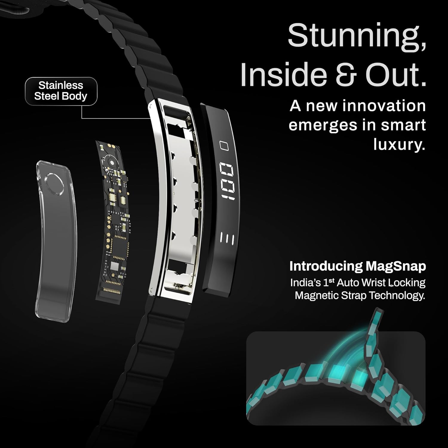 Pebble Newly Launched Arq Smart Bracelet – Digital Display | Heart Rate & SpO2 Monitoring | Sleep Tracker | Sports Modes | Magnetic Strap | Premium Build – Jet Black
