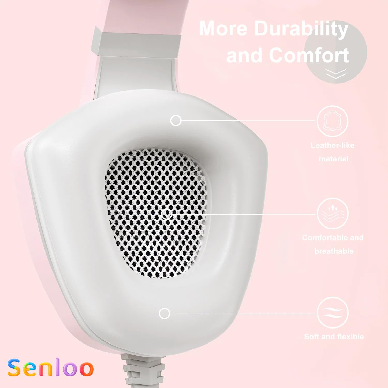 Comfortable Design: With leather ear cushions and an adjustable headband, these headphones are designed with a sleek pink color and ergonomic fit, ensuring long-lasting comfort during extended gaming sessions.