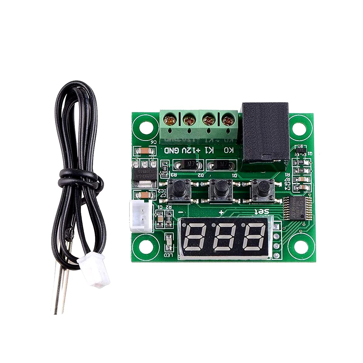 The XH W1209 digital temperature controller Module W/ Display and NTC Waterproof Temperature Sensor is an incredibly low cost yet highly functional thermostat controller. With this module, you can intelligently control power to most types of electrical device based on the temperature sensed by the included high accuracy NTC temperature sensor.