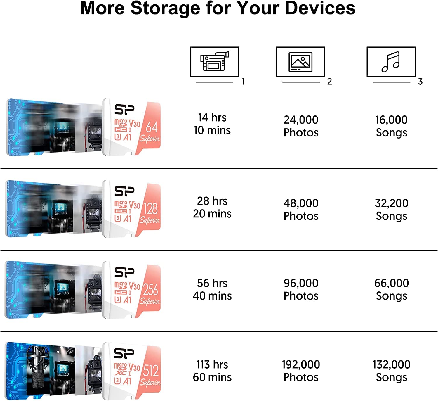 With UHS Speed Class 1 (U3) and Video Speed Class 30 (V30), the Superior microSDXC UHS-I card allows you to capture uninterrupted 4K Ultra HD videos.