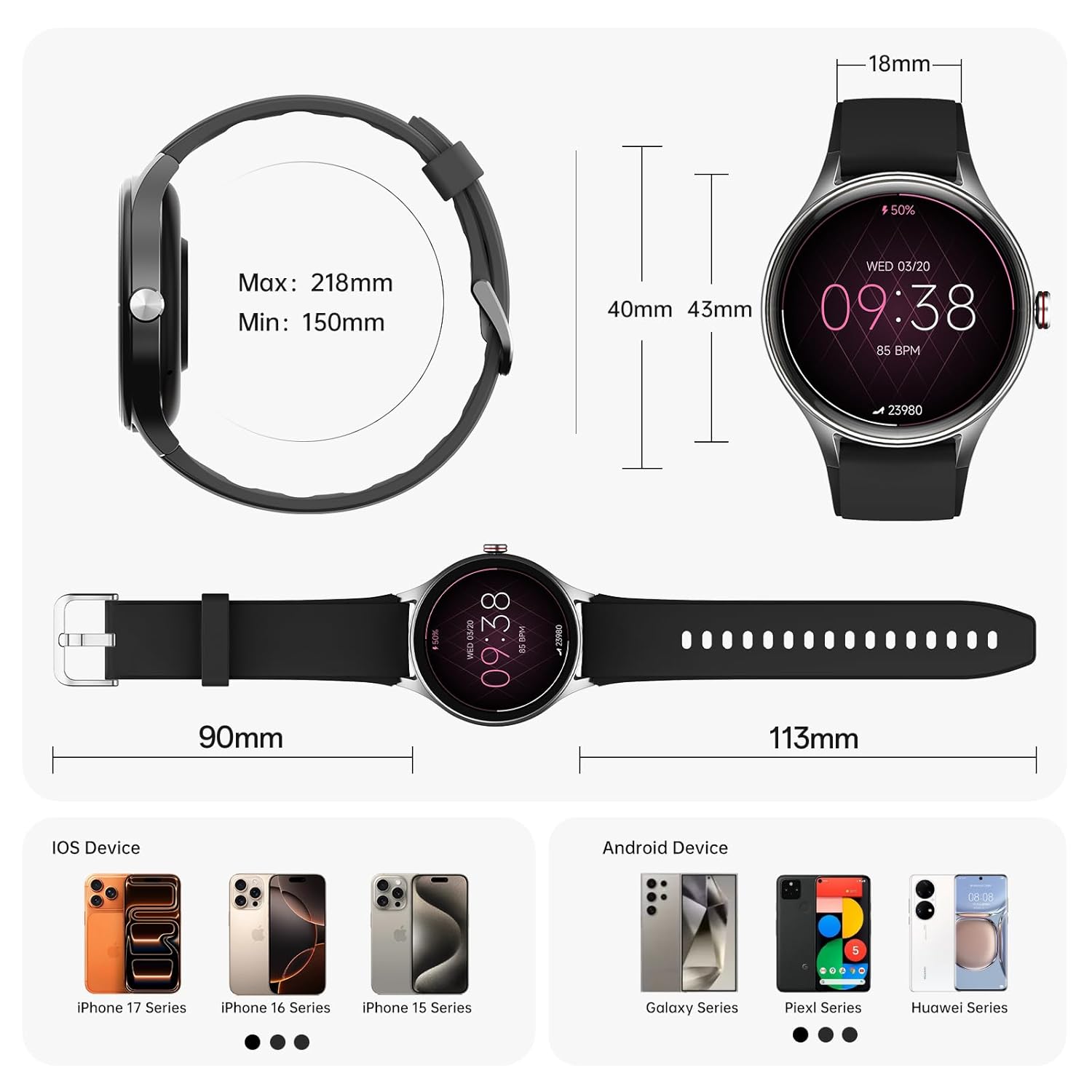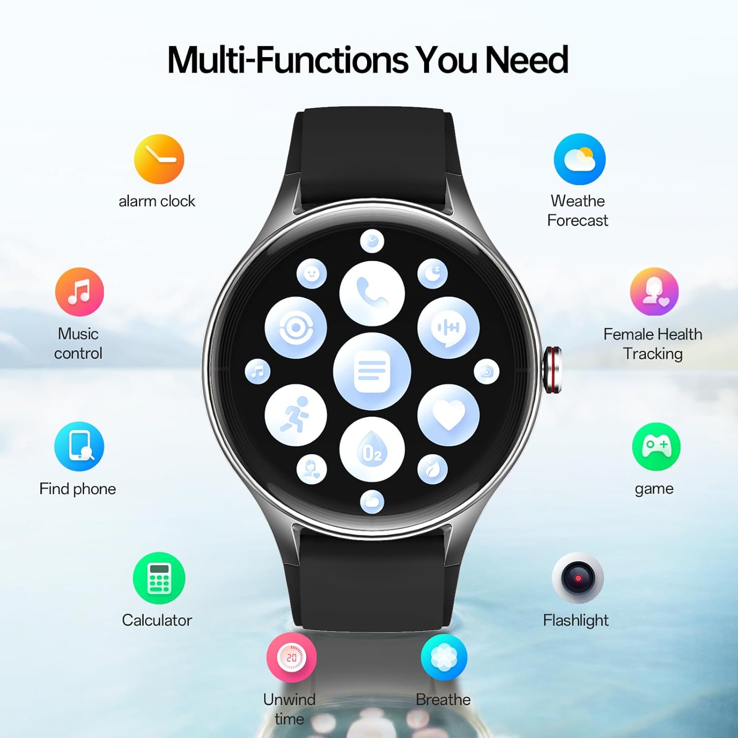 📞【Smart Notifications & 7 days Battery life – Stay Connected】 Keep your phone in your pocket,with Bluetooth 5.3 Messages from text messages, emails, and social media apps will sync and alert you in real time on your watch, so you never miss a beat, even when your hands are full.This smartwatch built-in DSP noise-reduction chip, you can make and receive crystal-clear calls directly from your wrist with minimal lag.Seamlessly pairs with iOS and Android phones. Enjoy up to 7 days of use on a single 1.5-hour charge. Keep you connected at all times